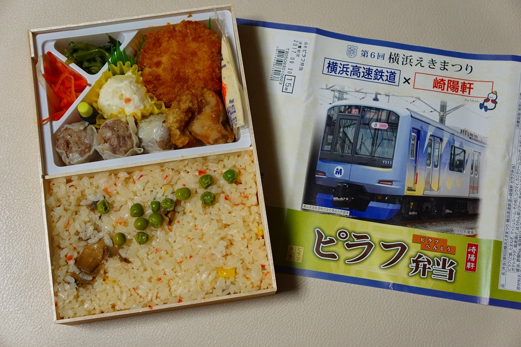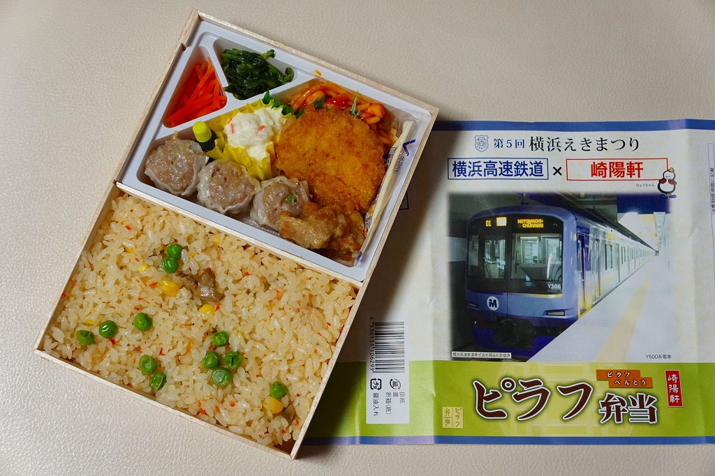 写真の車両はY500系電車。引き続き横浜高速鉄道の電車は、2004(平成16)年2月の開業からこのタイプのみ。掛紙以外は通常の「横濱ピラフ」と同じ。