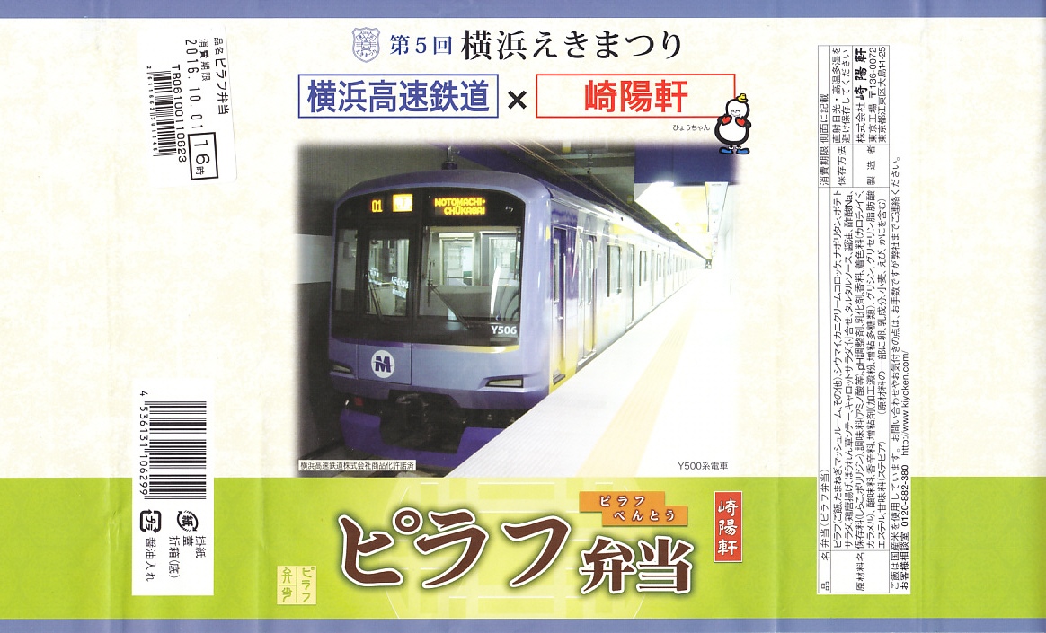 2016(平成28)年10月1日の調製である、横浜駅弁の掛紙。2016年10月1日から16日までの「第5回横浜えきまつり」の開催に合わせて、横浜駅に乗り入れる鉄道会社のうち、東急を除く5社それぞれの電車を掛紙にしたバージョンの、横浜高速鉄道版。