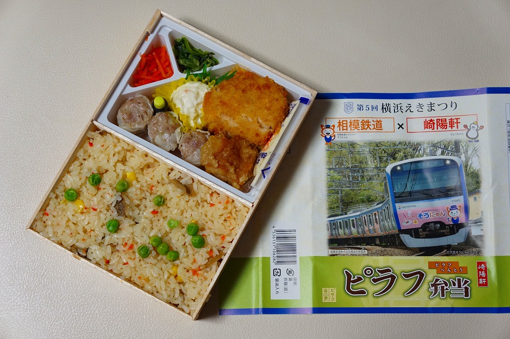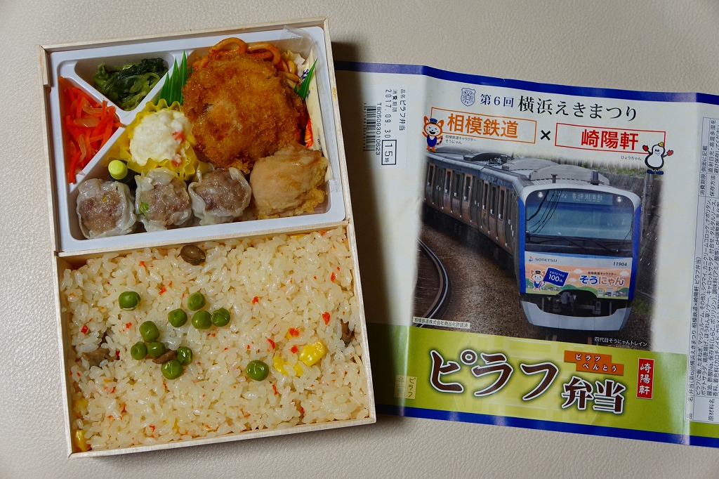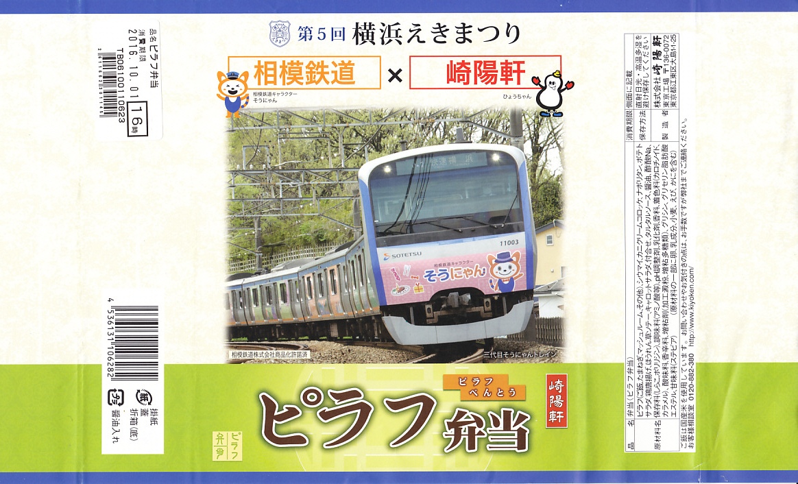 写真の車両は、2015(平成27)年3月デビューの11000系電車「NEWそうにゃんトレイン」。前年4月登場の相鉄のゆるキャラ「そうにゃん」の、その翌月にデビューしたラッピング電車「そうにゃんトレイン」の、デザインを新しくしたもの。掛紙以外は通常の「横濱ピラフ」と同じ。