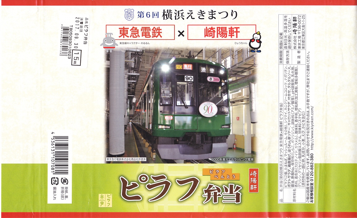 2017(平成29)年9月30日の調製である、横浜駅弁の掛紙。2017年9月30日から10月15日までの「第6回横浜えきまつり」の開催に合わせて、横浜駅に乗り入れる鉄道会社6社それぞれの電車を掛紙にしたバージョンの、3年ぶりに復活した東急電鉄版。