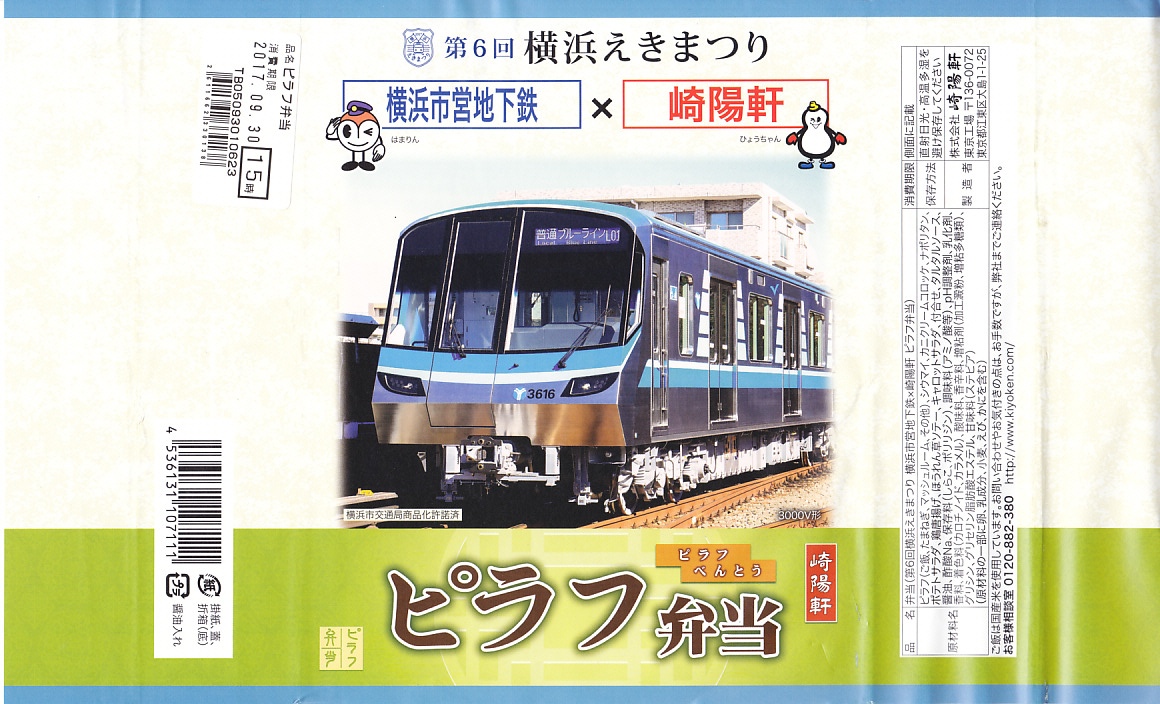 2017(平成29)年9月30日の調製である、横浜駅弁の掛紙。2017年9月30日から10月15日までの「第6回横浜えきまつり」の開催に合わせて、横浜駅に乗り入れる鉄道会社6社それぞれの電車を掛紙にしたバージョンの、横浜高速鉄道版。