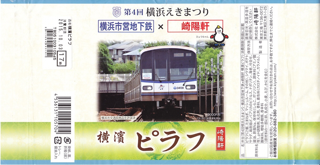 2015(平成27)年10月3日の調製である、横浜駅弁の掛紙。2015年10月3日から14日までの「第4回横浜えきまつり」の開催に合わせて、横浜駅に乗り入れる鉄道会社のうち、東急を除く5社それぞれの電車を掛紙にしたバージョンの、横浜市営地下鉄版。