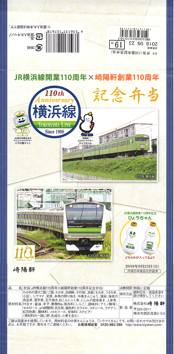 2018(平成30)年9月23日の販売と思われる、横浜駅弁の掛紙。JR東日本横浜支社と調製元は、JR横浜線の開業110周年と創業110周年を記念し、2018(平成30)年9月23日から横浜駅と東神奈川駅ビルと中山駅ビルと本店で、3000個を限定販売した。掛紙には昭和60年頃と現在の横浜線電車の写真と、両社のキャラクターなどを掲載。中身は赤飯と茎わかめ御飯と、有頭海老や焼き魚、煮物やタケノコ煮やシウマイ3個などと、掛紙にも記される特製絵柄のひょうちゃんが1個だった。