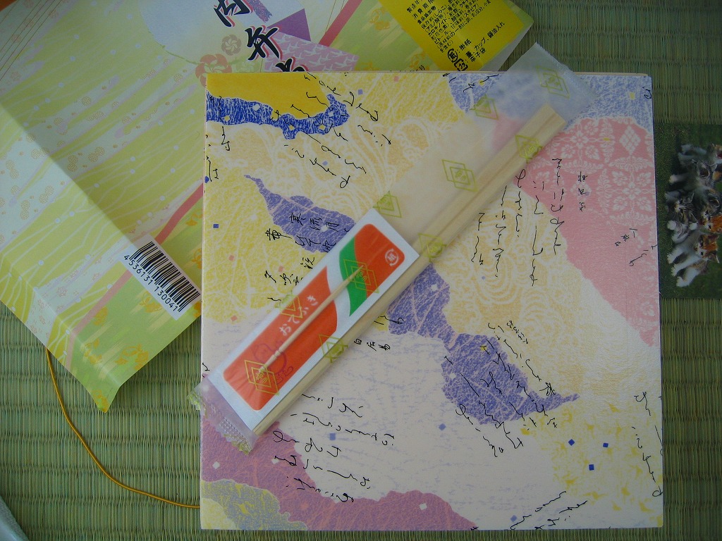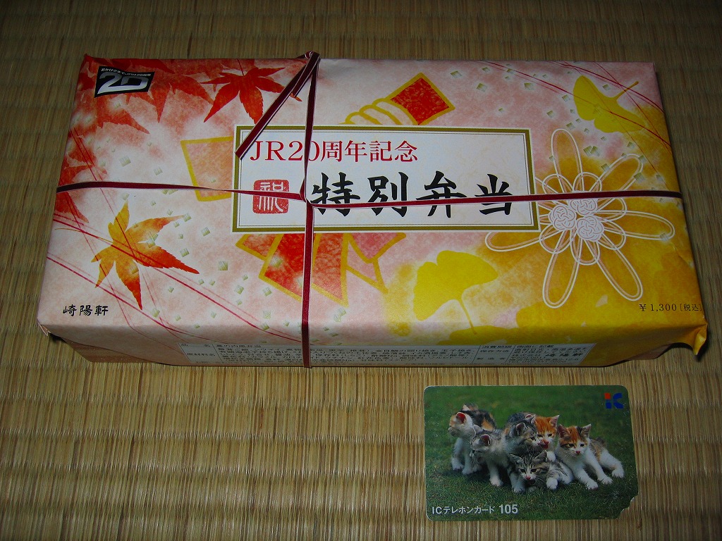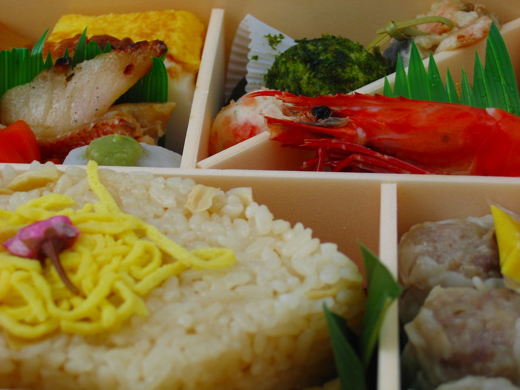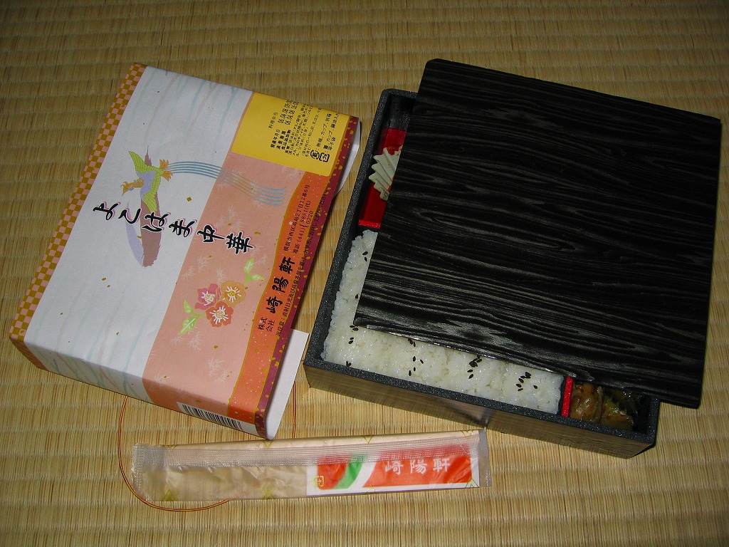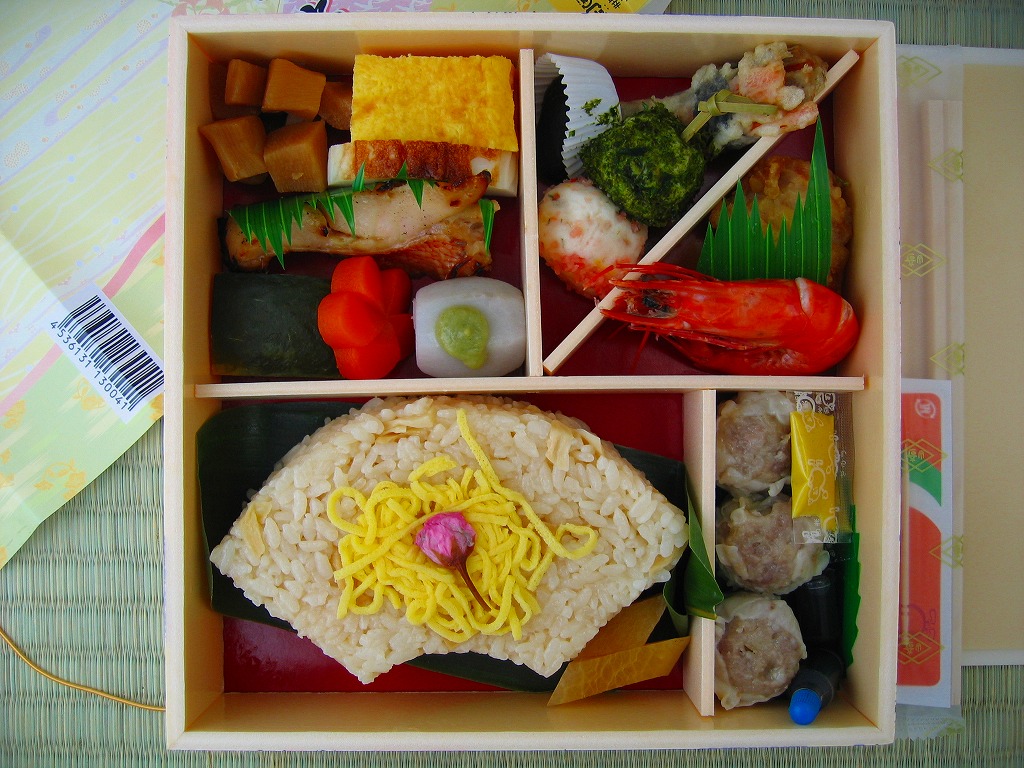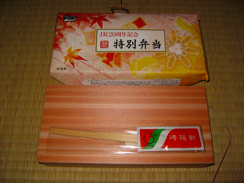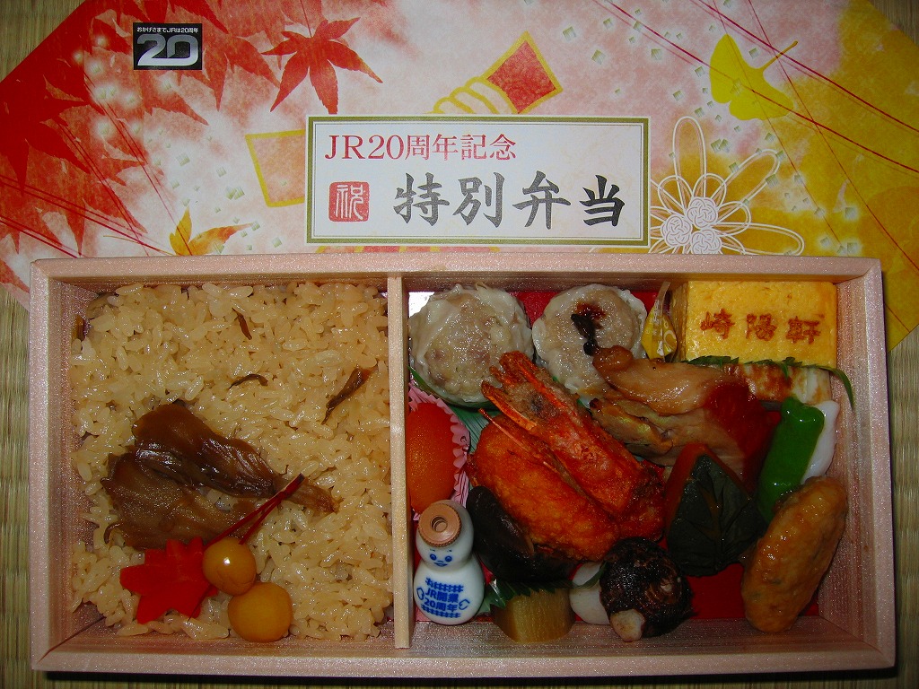 2005(平成17)年4月9日と10日に東京駅で実施の駅弁の日記念駅弁大会で販売された、崎陽軒の駅弁の日記念弁当。大きめな正方形の容器を、昨今の崎陽軒の駅弁掛紙デザインによくある淡い雰囲気の掛紙をかけて、金色のゴムでしばる。中身は桜花を載せた扇形の茶飯に、海老や焼き魚に蒲鉾と玉子焼と煮物類などを付けて、シウマイ3個を添える。