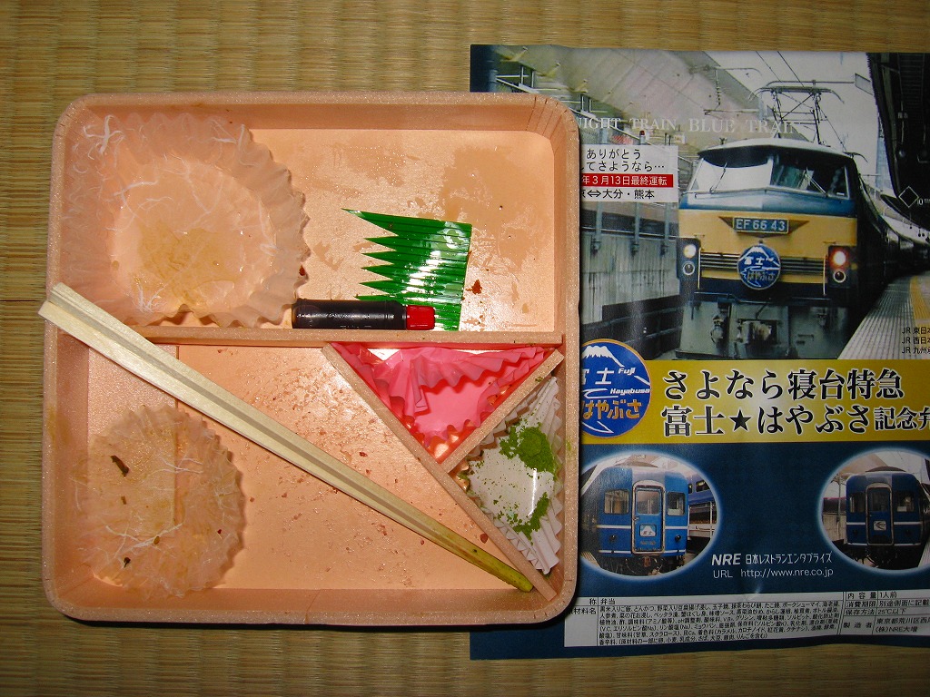 2009(平成21)年3月7・8日に横浜駅西口で開催された、寝台特急富士・はやぶさ廃止記念グッズ販売イベントにて販売されたお弁当で、調製元は小田原駅弁の東華軒。木目柄の容器を、寝台特急列車の写真を使った掛紙で包み、紙ひもで十字にしばる。松花堂タイプにトレーと仕切りで4分割された中身は、桜花や錦糸卵に桜でんぶを載せた茶飯、カボチャやサトイモなどの煮物、玉子焼に焼鮭にカマボコ、ナスとタケノコとタラの芽の天ぷらなど。