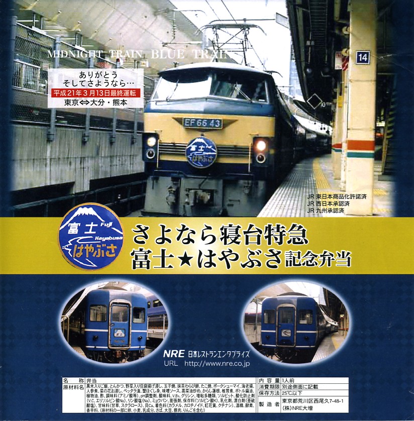 2009(平成21)年3月7・8日に横浜駅西口で開催された、寝台特急富士・はやぶさ廃止記念グッズ販売イベントにて販売されたお弁当。東京駅と鉄道博物館で3月1日から14日まで販売された「さよなら寝台特急富士★はやぶさ記念弁当」と、中身や価格は同一であるが、掛紙の絵柄や写真が異なる特別版となっている。写真の撮影地は横浜駅ではなく東京駅なのだが。