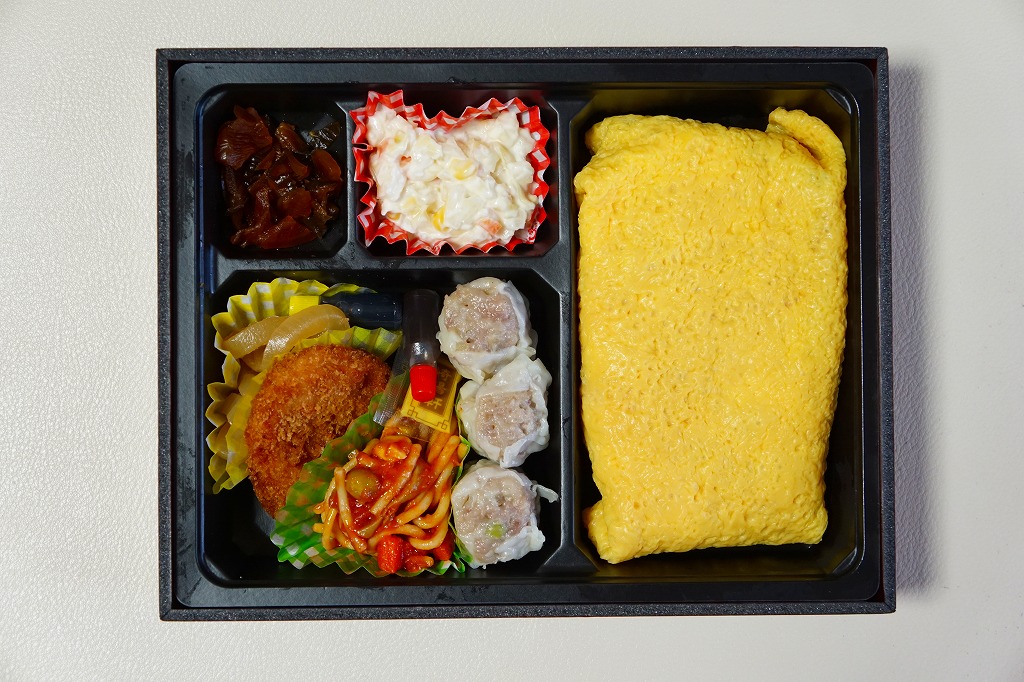 中身も炒飯弁当とほぼ同じで、炒飯にスペイン風オムレツ、春巻き、ポテトサラダ、鶏唐揚、シウマイ3個、漬物、紅生姜。炒飯弁当のおかずのシウマイ3個と鶏唐揚を残し、他をスペイン風オムレツ、春巻き、ポテトサラダにした感じ。
