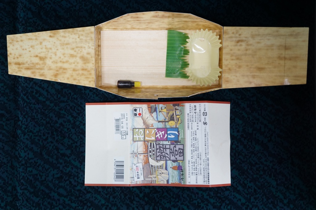 竹皮を模したボール紙の箱を、1872(明治5)年の鉄道開業当時の錦絵を思わせる絵柄の掛紙で巻く。中身は日の丸と赤飯の、おにぎりというか小判型の型押し飯と、タケノコ煮、シイタケとニンジンの煮物、たくあん、シウマイ2個。この容器と中身も駅弁発祥宇都宮駅説により、竹皮におにぎりとたくあんを包んだものを模したという。シウマイ弁当や赤飯弁当など、既存の横浜駅弁と同じ味がした。