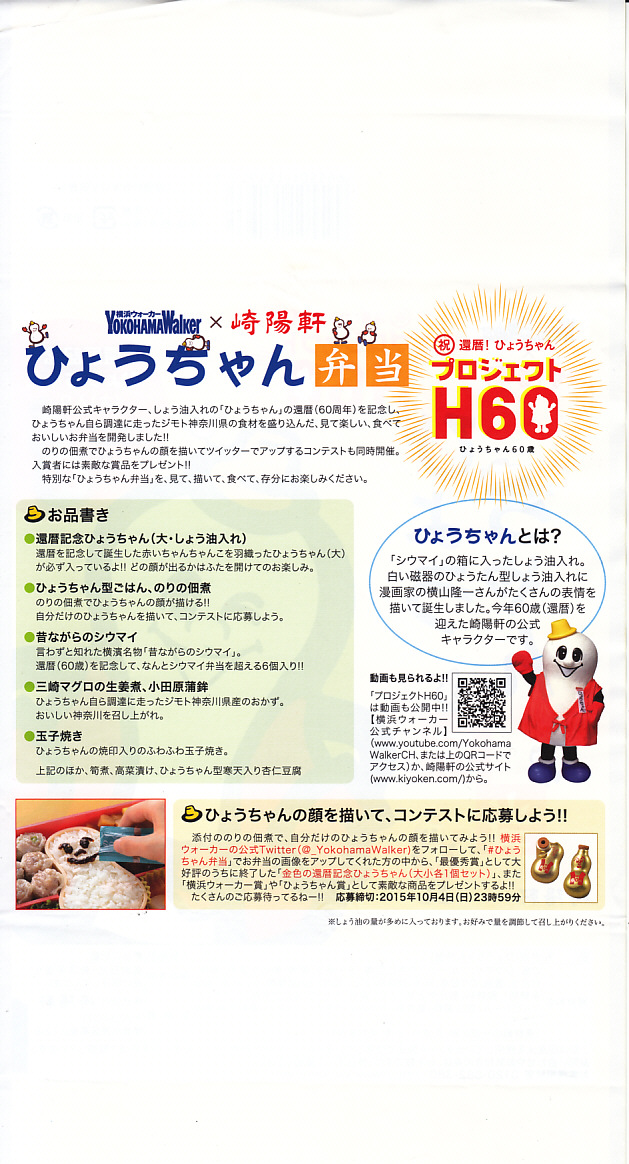 崎陽軒とKADOKAWAのコラボレーション企画、醤油入れ「ひょうちゃん」60周年と隔週刊雑誌「横浜ウォーカー」とのタイアップで、2015年9月24日から30日までに2,100個が販売された記念弁当。