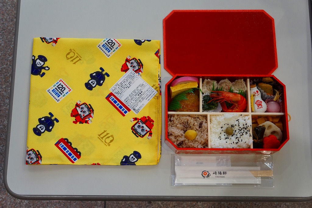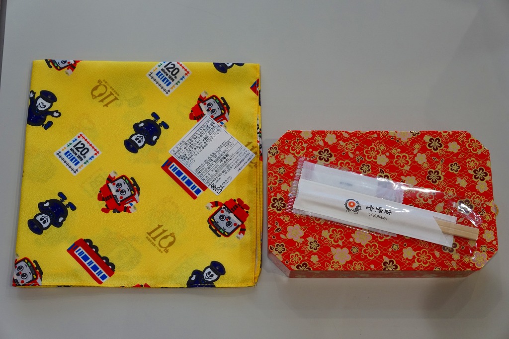 京浜急行電鉄の創立120周年と、駅弁の調製元である崎陽軒の創業110周年とシウマイ誕生90周年を記念し、2018(平成30)年6月1日から5日まで、横浜や上大岡など京浜急行電鉄沿線の崎陽軒売店で販売した記念弁当。それらの記念する絵柄「けいきゅん」、京急電車、京急120年ロゴ、ポリスひょうちゃん、崎陽軒110周年ロゴ、シウマイ90周年ロゴを並べた黄色い風呂敷で、赤飯弁当タイプの容器を包む。