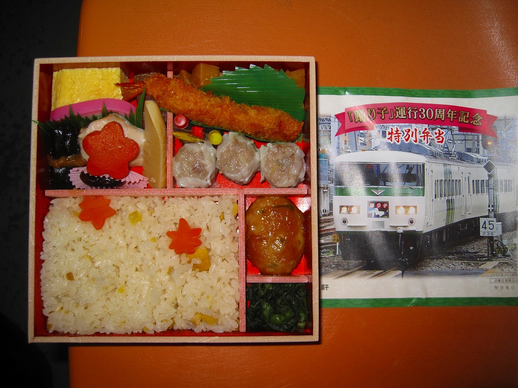 木目柄で長方形の容器を、紅葉と黄葉を背景に駅弁の名前を書いた掛紙で包む。中身は舞茸御飯に金目鯛照焼、揚げ有頭海老、つくね、イカやカボチャなどの煮物、蒲鉾と社名焼き印入り玉子焼、特製シウマイ2個にひょうちゃんなど。見栄えも風味も美しい中身に、記念品の華やかさと調製元の実力が光る。