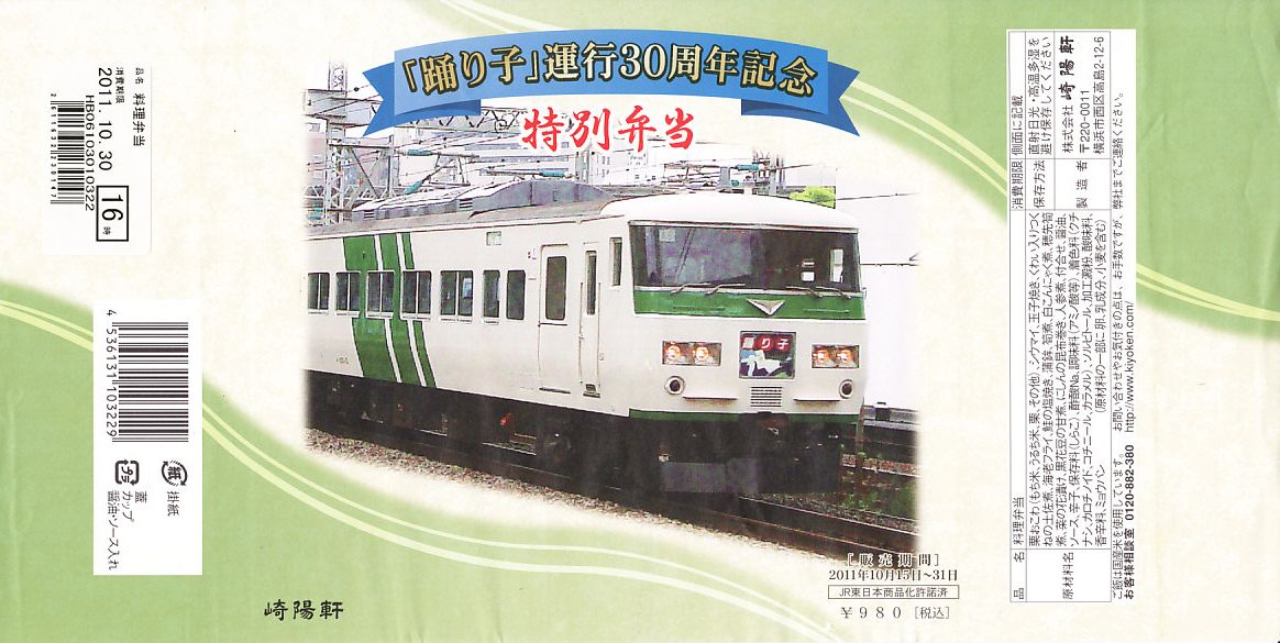 掛紙記載事項のとおり、特急「踊り子」デビュー30周年を記念し、2011(平成23)年10月1日から31日まで販売された記念駅弁。横浜駅弁で「おべんとう秋」などに使う正方形の容器に、踊り子号の写真を掲載した販売期間前半の10月1日から14日までのバージョンである掛紙を巻く。
