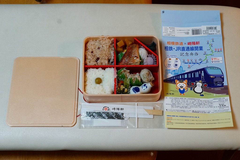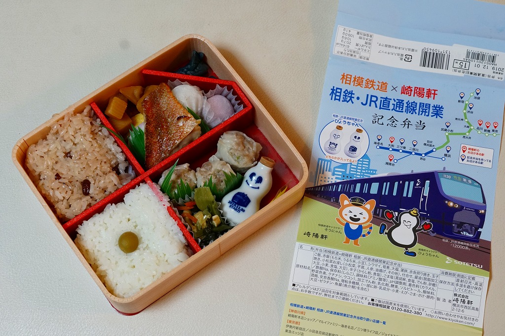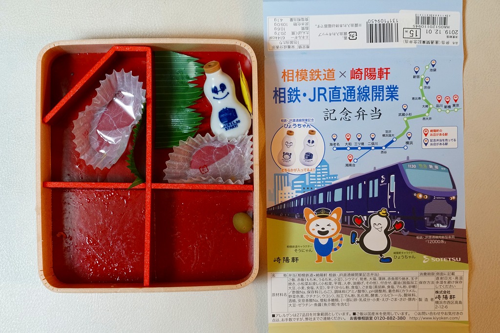 相鉄・JR直通線とは、横浜市内で西谷駅と羽沢横浜国大駅をノンストップで結ぶ、約2kmの鉄道新線。ここを経由して、相模鉄道の海老名駅や二俣川駅などと、JR東日本の新宿駅や武蔵小杉駅などとの間で、一日46往復の直通電車が走る。高度経済成長期に沿線人口も輸送量も激増し、バブル崩壊以降にいずれも減少に転じた相模鉄道では、東京都心への直通は沿線価値と知名度と輸送量を確保するための悲願であり、構想の表面化から約15年をかけた大事業であった。この弁当の発売日から、ヨコハマネイビーブルーを名乗る真っ青な電車が、湘南新宿ラインあるいは埼京線や横須賀線の経路を走り始めた。