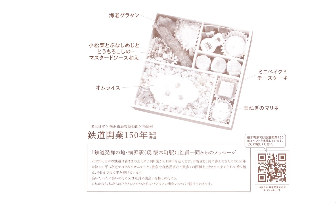 掛紙の表面には鉄道開業当時の錦絵を掲載、裏面には写真付きのおしながきの一部と桜木町駅社員のメッセージを掲載。中身はオムライス、海老グラタン、小松菜とぶなしめじととうもろこしのマスタードソース和え、海老フライ、鶏唐揚、ポテトサラダ、玉ねぎのマリネ、ミニベイクドチーズケーキ、昔ながらのシウマイ3個、特製の磁器の醤油入れ。鉄道開業の地である横浜らしさを洋風のおかずで表現したという。