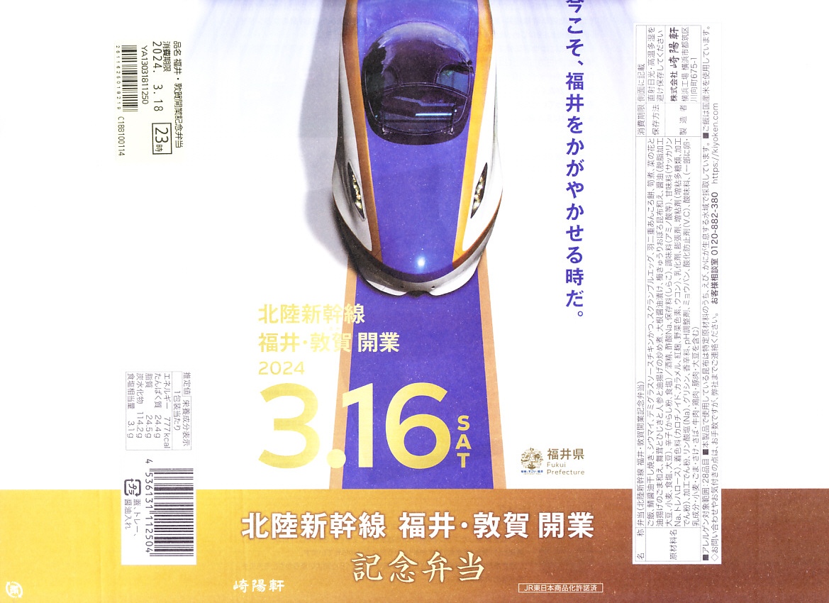 2024(令和6)年3月16日から24日まで、調製元の神奈川・東京エリアを中心とした約150店舗で、5,000個を予約販売。調製元と福井県が2022年7月に締結した相互協力協定のもと、2024年3月16日の北陸新幹線の福井県内への延伸開業にちなんで発売。直営15店舗では予約なしでも販売したという。