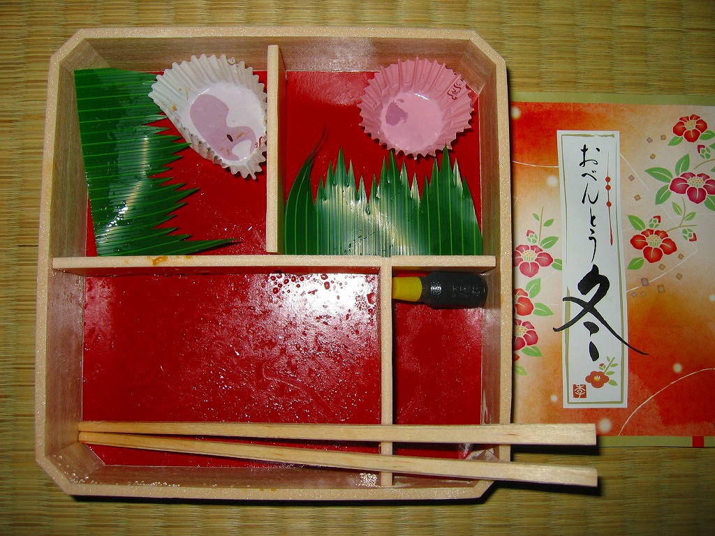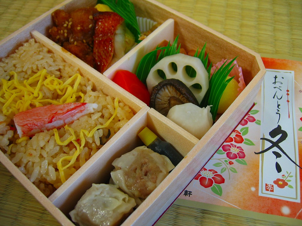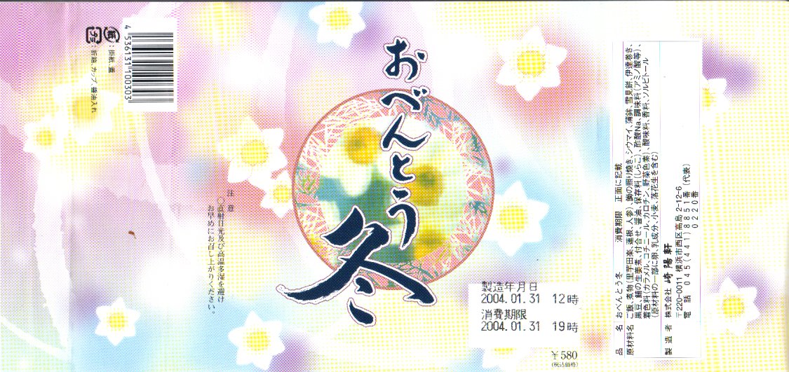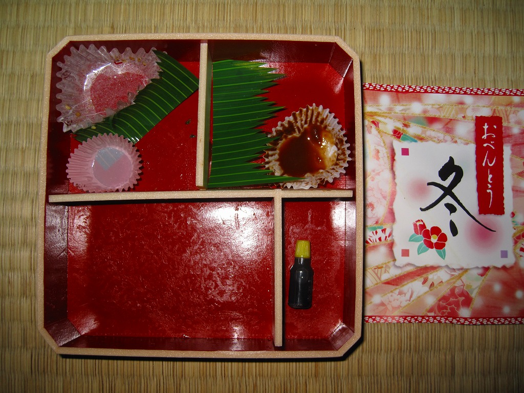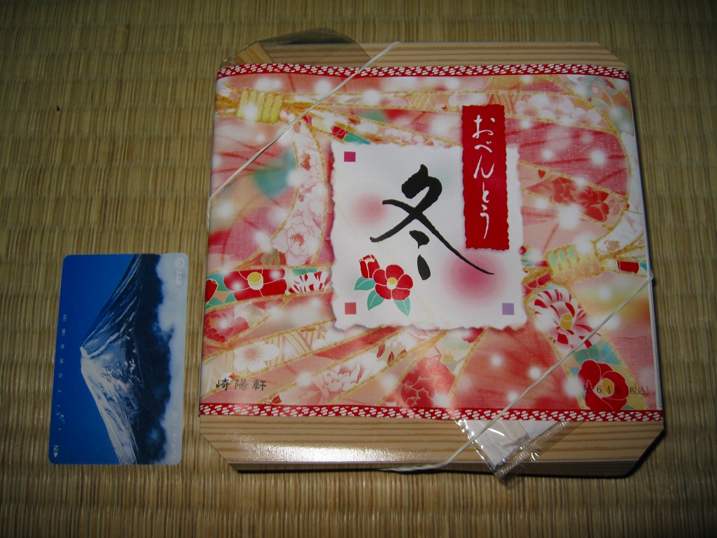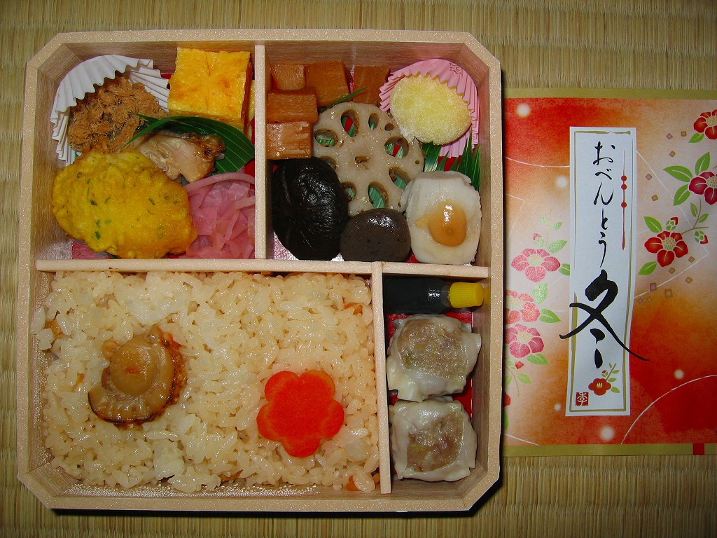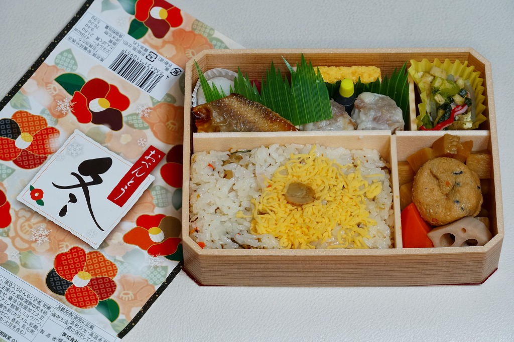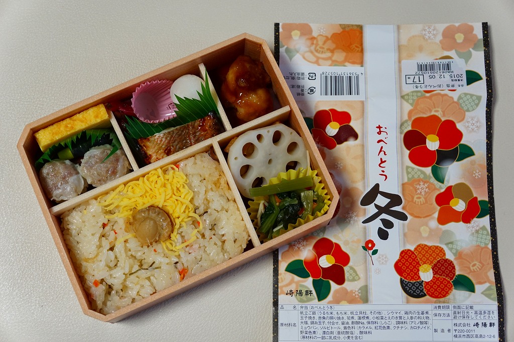 2003(平成15)年12月1日に初めて発売した、横浜駅の冬季限定の駅弁。他の季節と同じ小ぶりな正方形の容器を使用、中身は2003年版で、白胡麻をかけた白御飯に、正月のおせち料理をイメージしたという蒲鉾や黒豆や伊達巻に昆布天、他にはマグロやブリなどに、横浜らしくシウマイ2個と、デザートには雪見餅。これらの季節駅弁はシウマイ御弁當と同様、駅弁としてだけでなく街弁やデパ弁としても親しまれている。