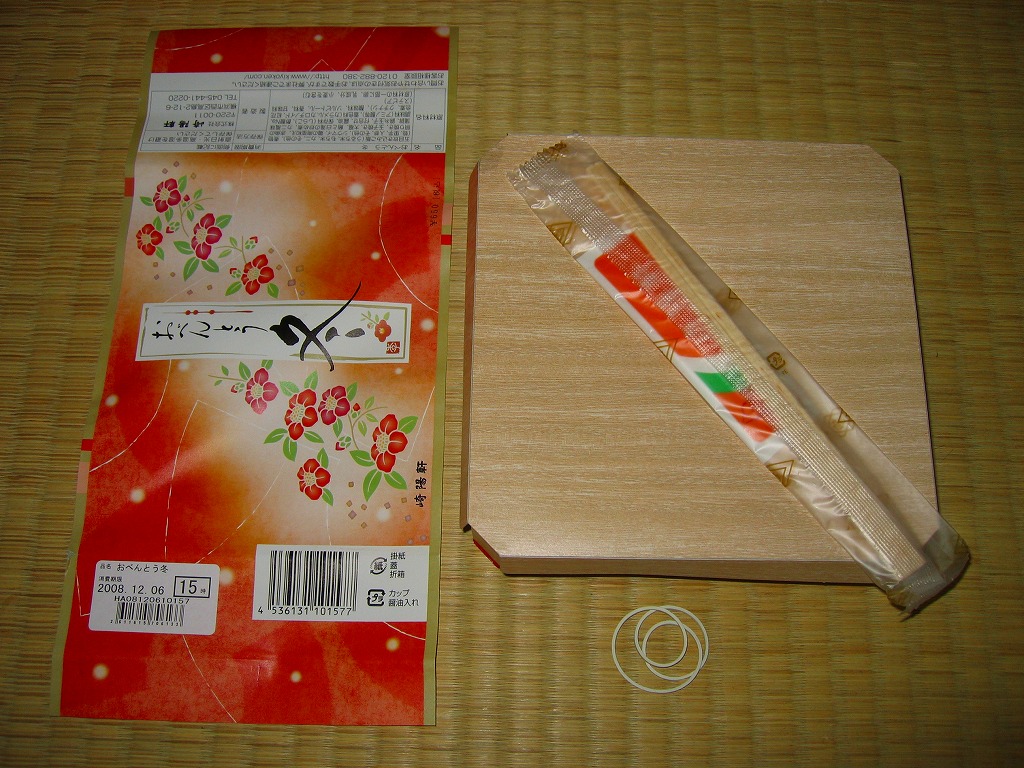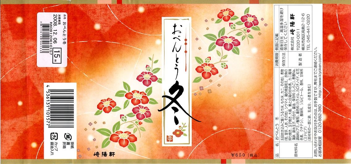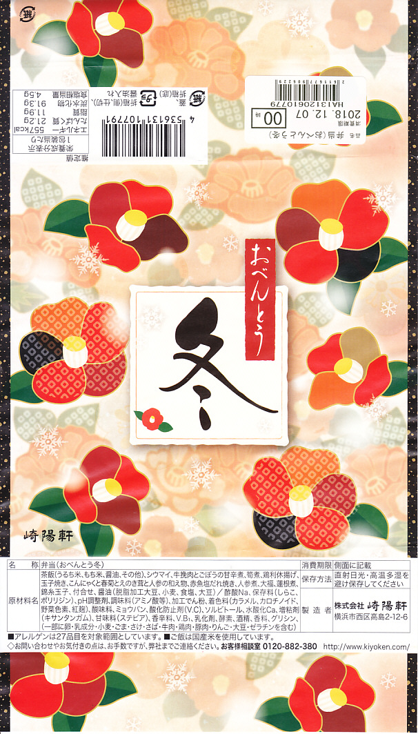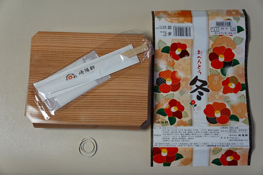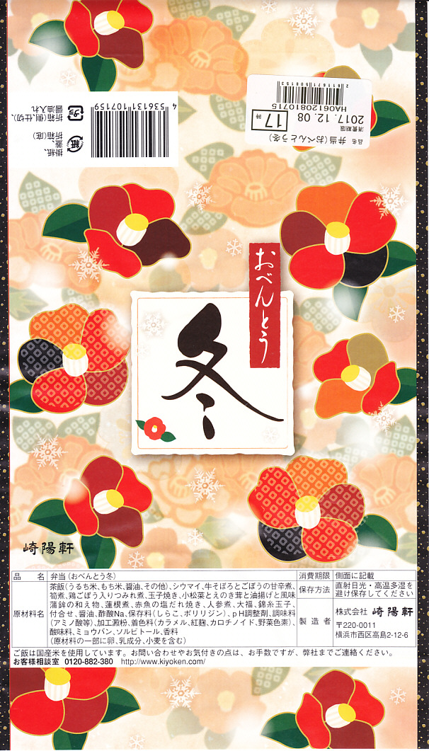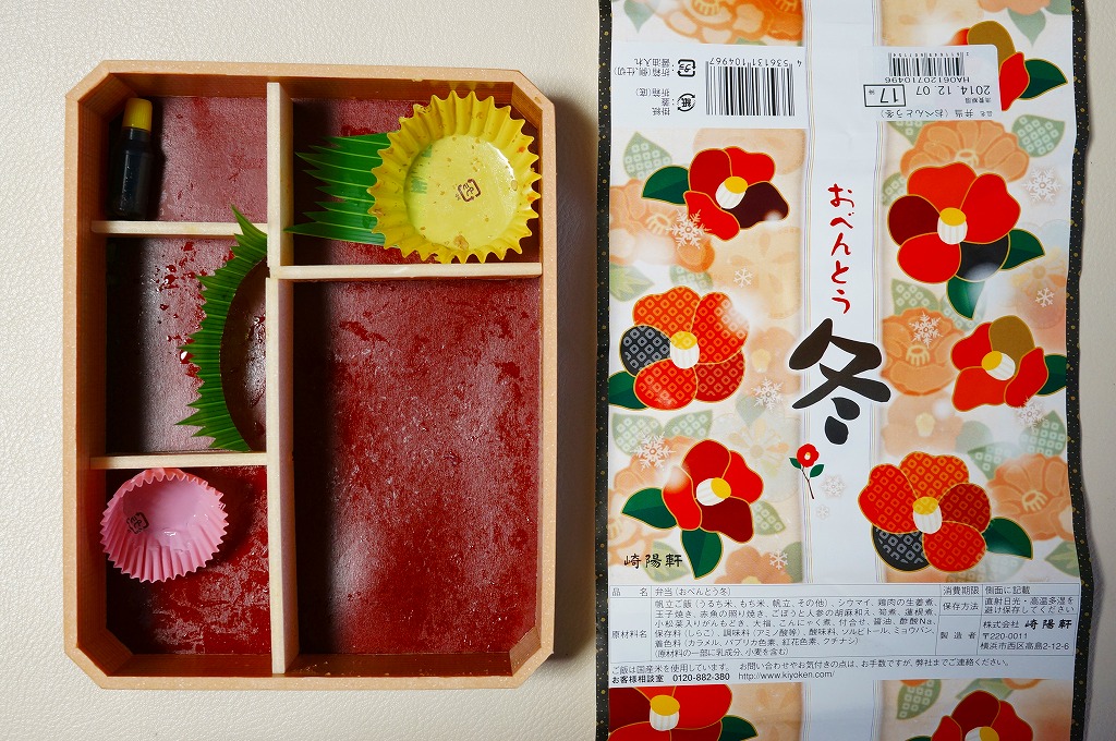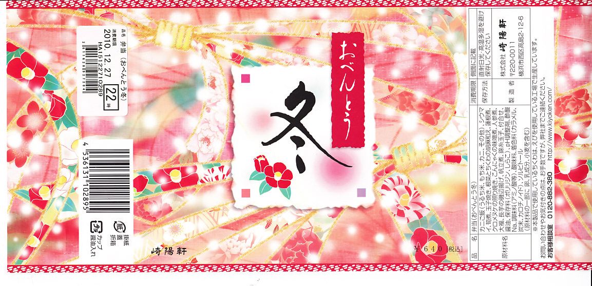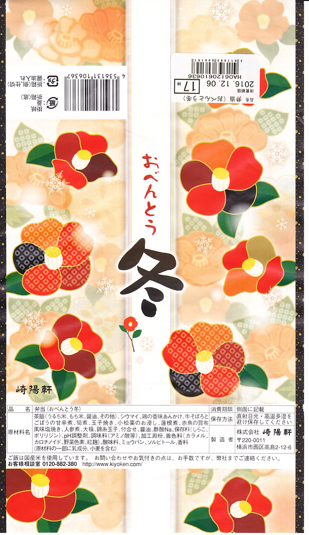 2003(平成15)年12月に初めて販売した、横浜駅の冬駅弁「おべんとう冬」の2014(平成26)年版で、12月1日から1月31日までの販売。この年の「秋」からのリニューアルに従い、容器が少し細長くなり、掛紙で引き続きツバキを描きながら横長から縦長に変わり、価格は30円のアップ。