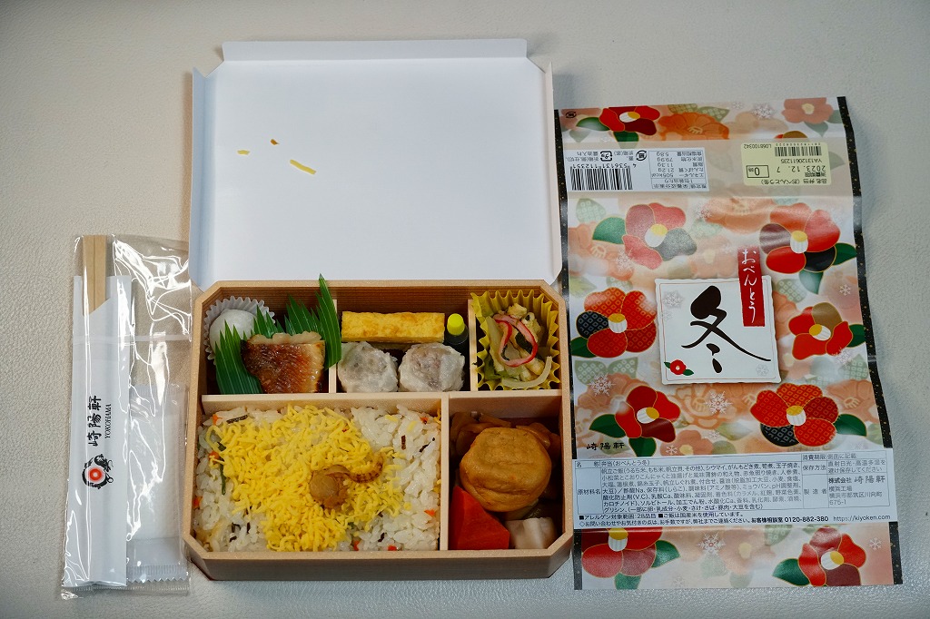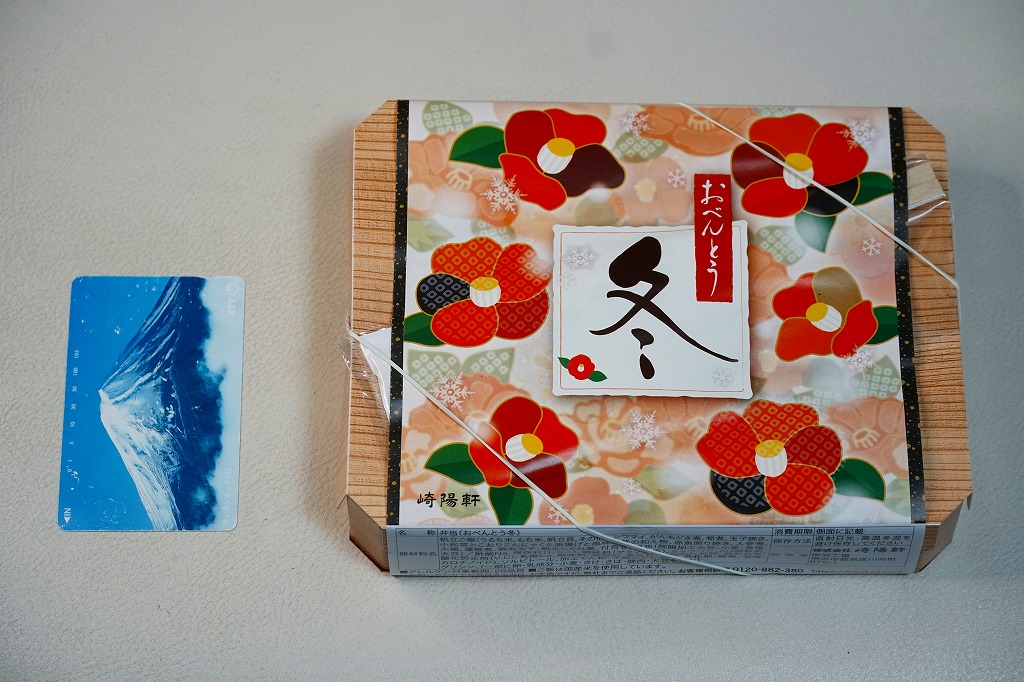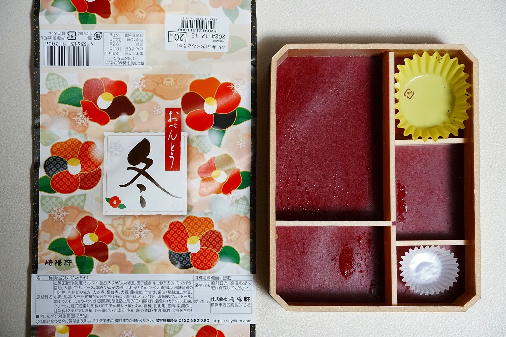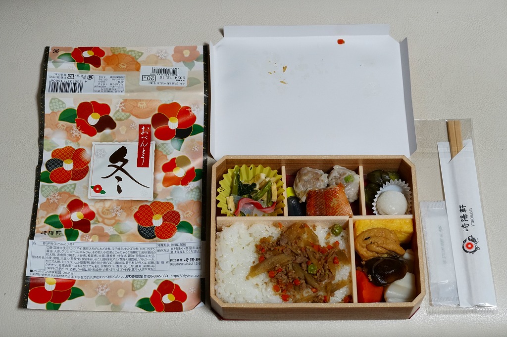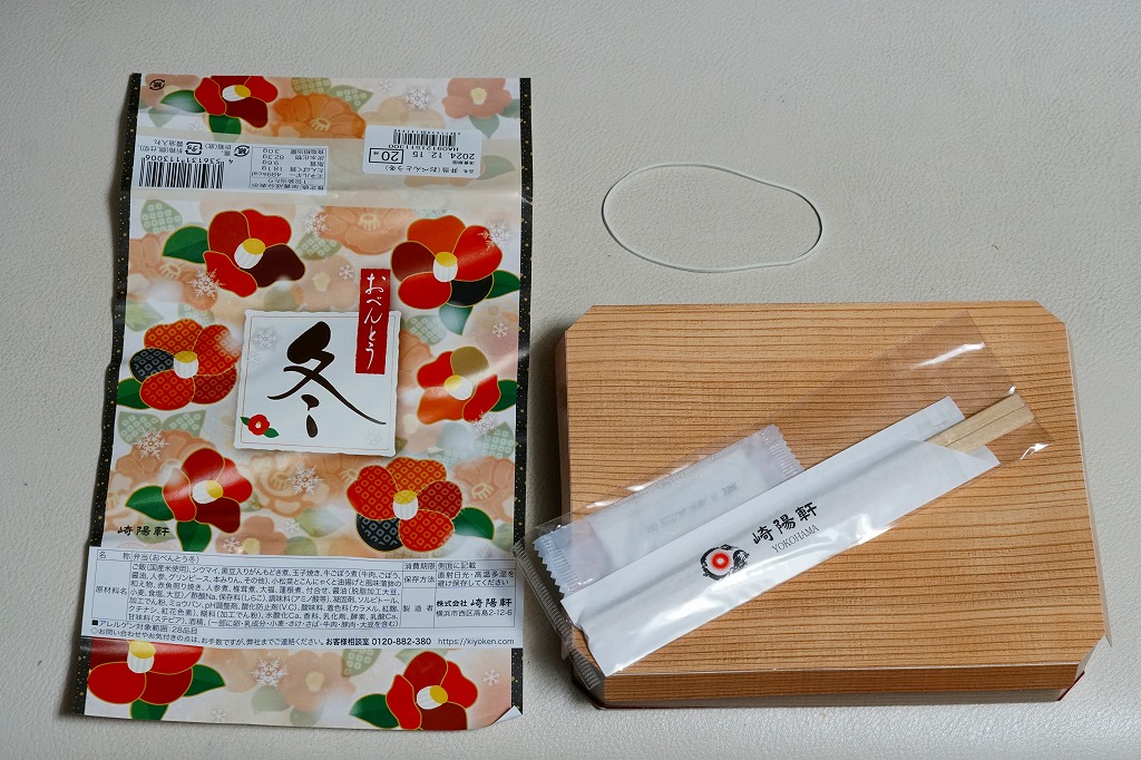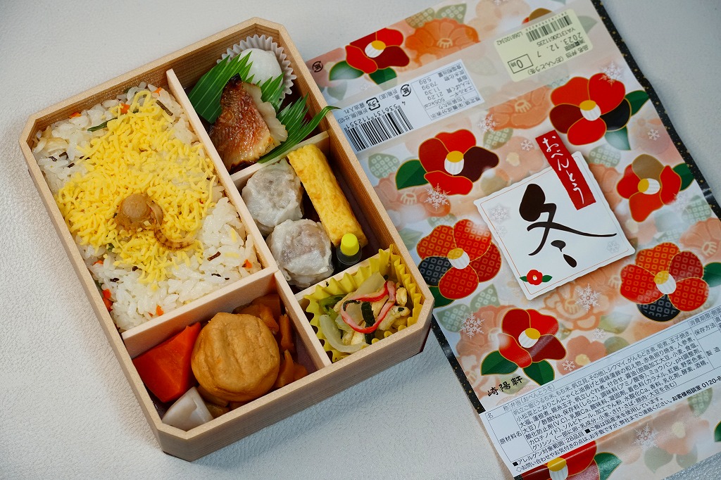 2003(平成15)年12月に初めて販売した、横浜駅の冬駅弁「おべんとう冬」の2024(令和6)年度版で、12月1日から1月31日までの販売。掛紙のツバキの絵柄は2017年から変わらない。中身は白飯に牛ごぼう煮とグリーンピースを載せ、赤魚の照焼、がんもどき煮、小松菜とこんにゃくと油揚げと風味蒲鉾の和え物、レンコンとニンジンとシイタケの煮物、玉子焼、きゅうり漬け、小粒大福、シウマイ2個を添えるものに変化。内容が少し簡素化された一方で、価格はまた50円上がった。