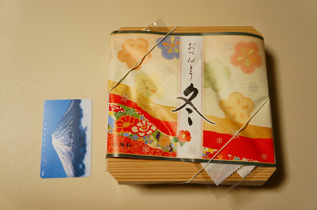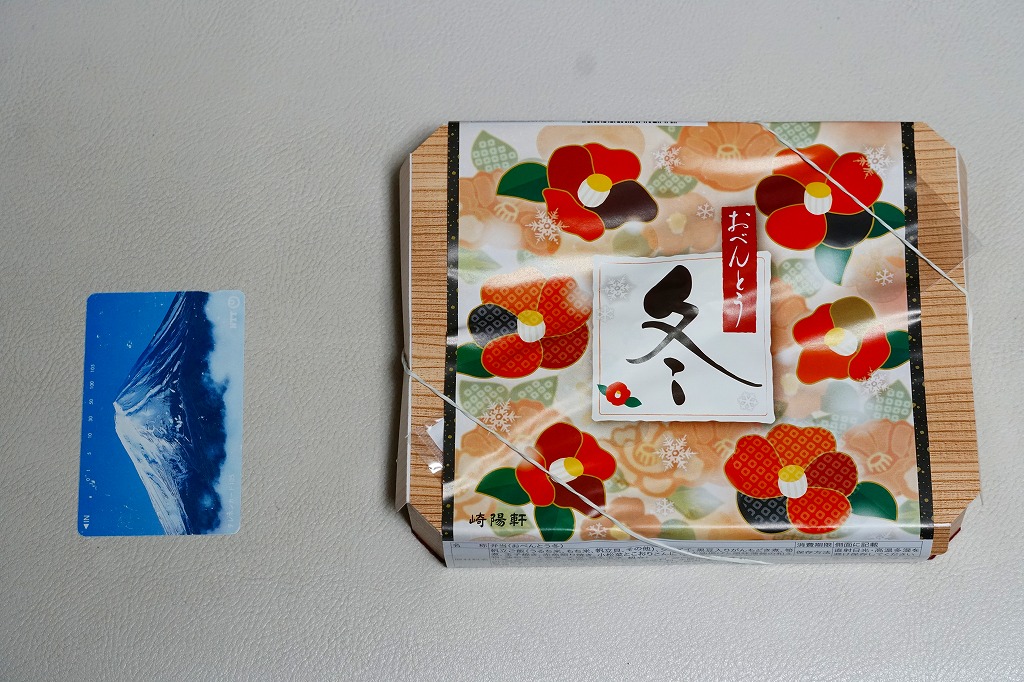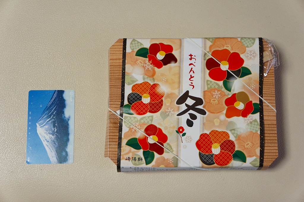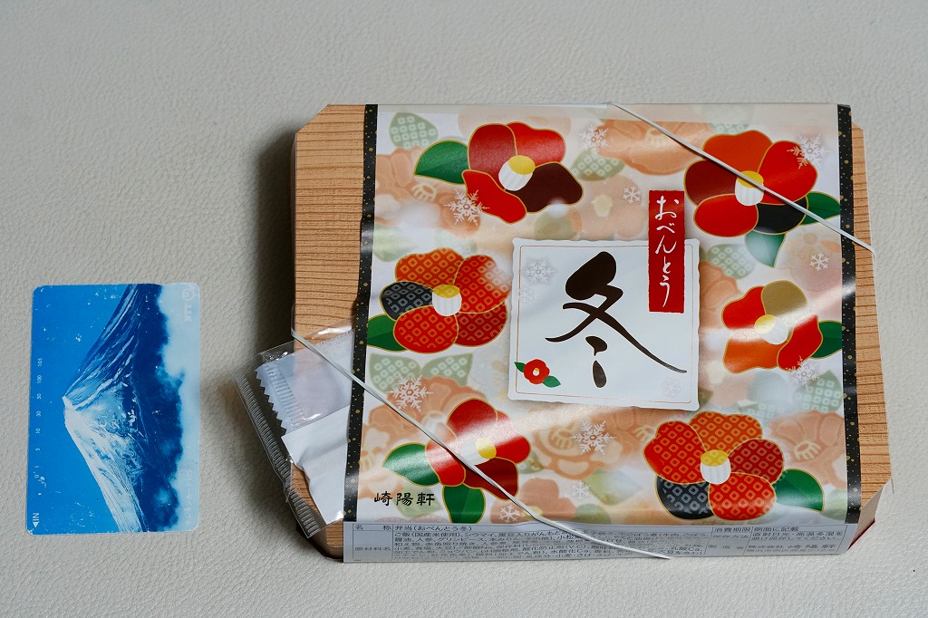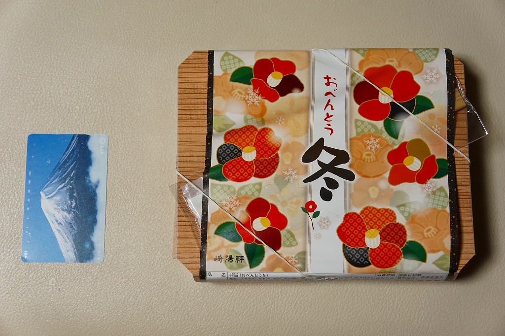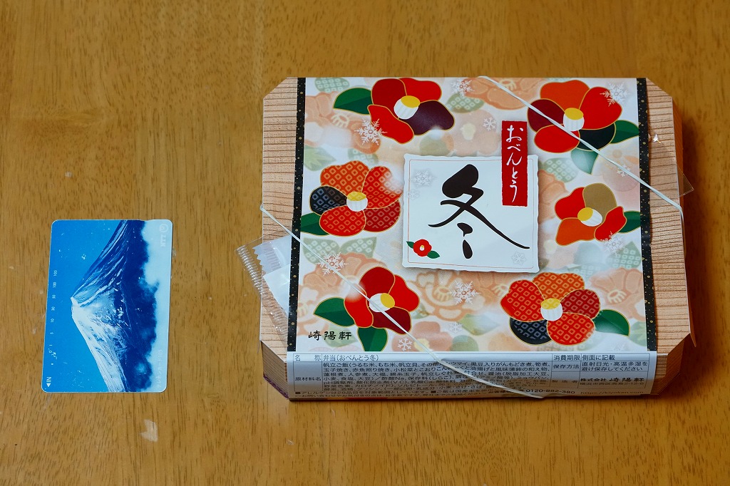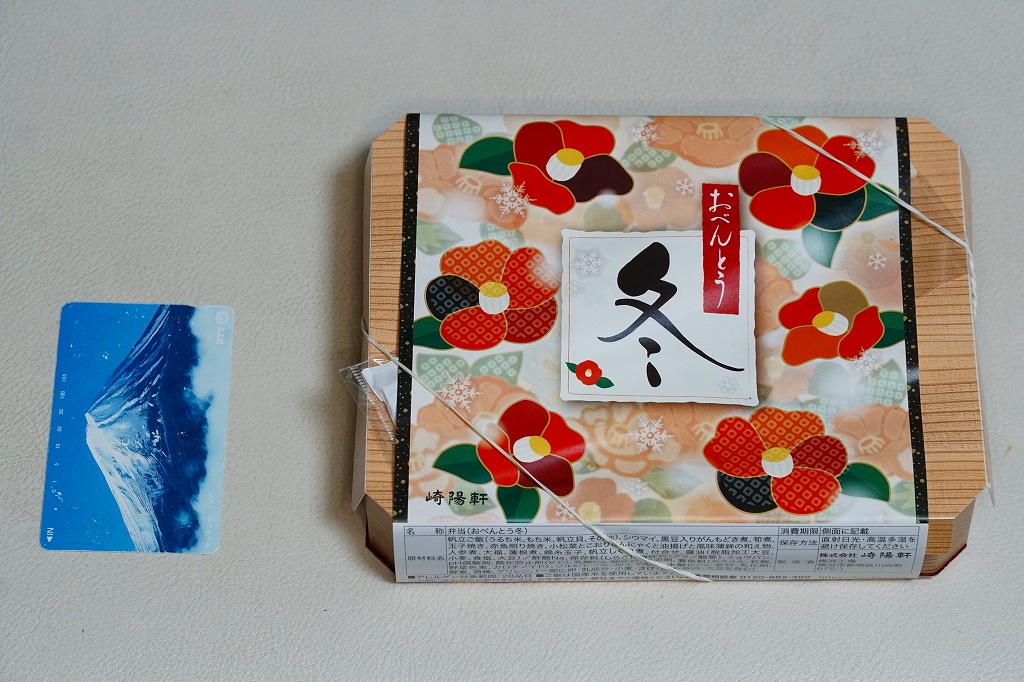 2003(平成15)年12月に初めて販売した、横浜駅の冬駅弁「おべんとう冬」の2024(令和6)年度版で、12月1日から1月31日までの販売。掛紙のツバキの絵柄は2017年から変わらない。中身は白飯に牛ごぼう煮とグリーンピースを載せ、赤魚の照焼、がんもどき煮、小松菜とこんにゃくと油揚げと風味蒲鉾の和え物、レンコンとニンジンとシイタケの煮物、玉子焼、きゅうり漬け、小粒大福、シウマイ2個を添えるものに変化。内容が少し簡素化された一方で、価格はまた50円上がった。
