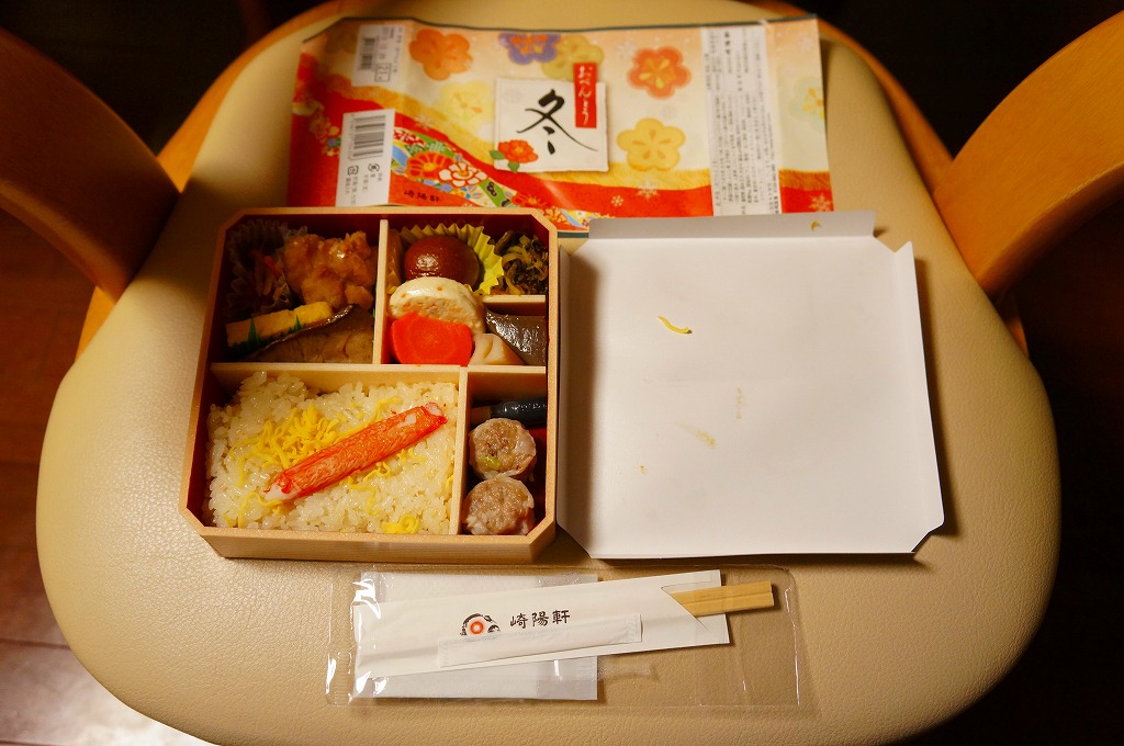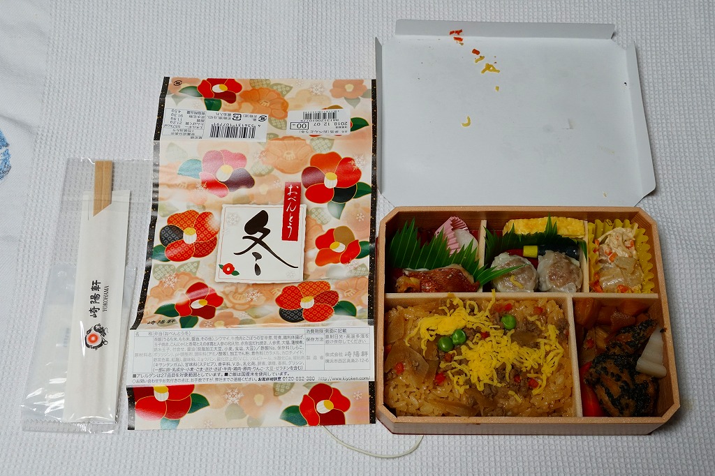2003(平成15)年12月に初めて販売した、横浜駅の冬駅弁「おべんとう冬」の2016(平成28)年版で、12月1日から1月31日までの販売。掛紙と容器は前年と同じ。中身には変化があり、牛そぼろとごぼうの甘辛煮の茶飯に、赤魚の昆布風味塩焼き、鶏肉の香味あんかけ、レンコンとニンジンの煮物、小松菜のおひたし、タケノコ煮、玉子焼、しば大根漬け、小粒大福、シウマイ2個。茶飯がもちもちして、油っこくて、甘辛い味付けが強めに出ていて、今までの崎陽軒にないような味を持っていた。価格は20円のアップ。