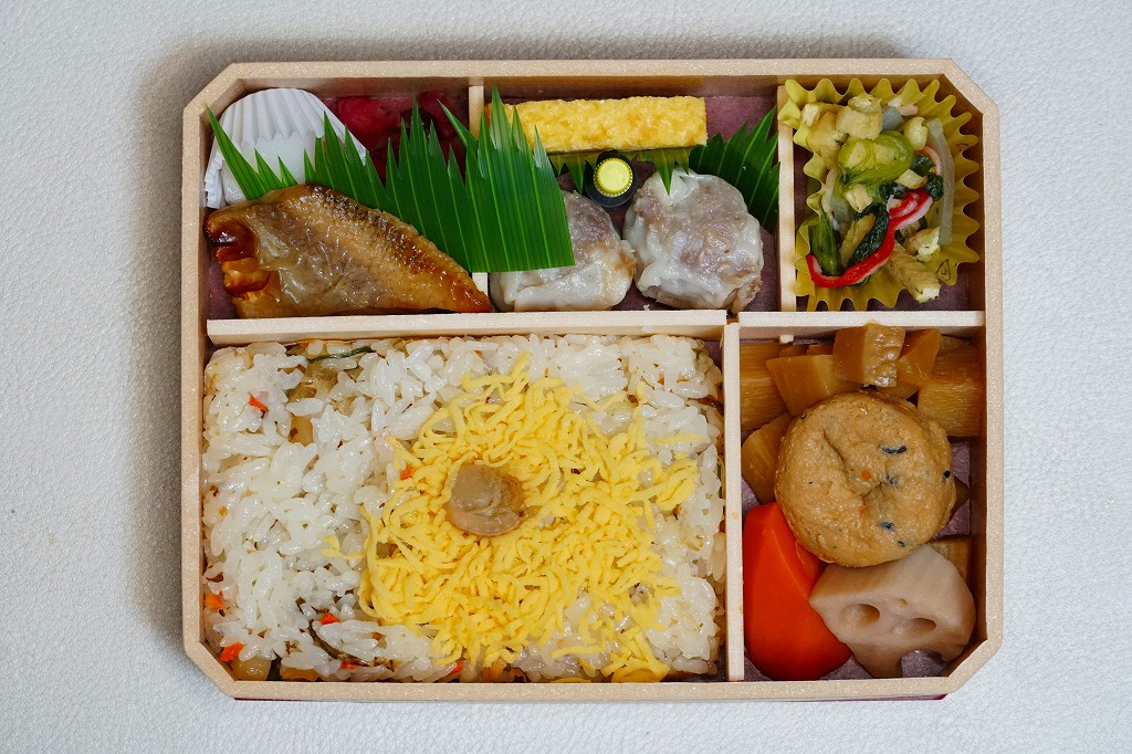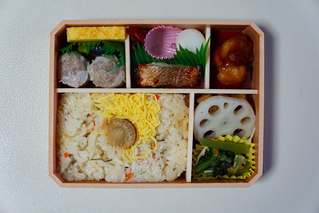 今回の中身は帆立御飯、赤魚照焼、鶏生姜煮、梅型こんにゃく煮、小松菜入りがんもどき煮、蓮根煮、根菜ごま和え、タケノコ煮、玉子焼、野沢菜ときゅうりの漬物、小粒大福、昔ながらのシウマイ2個。「冬」は中身もリニューアルされた感じ。