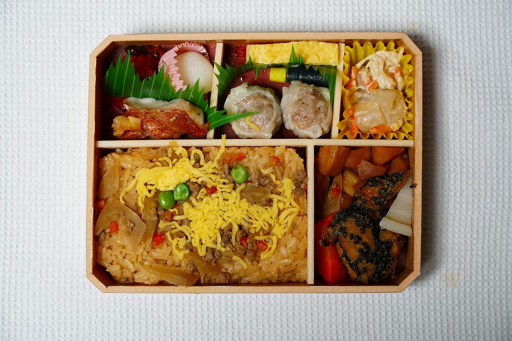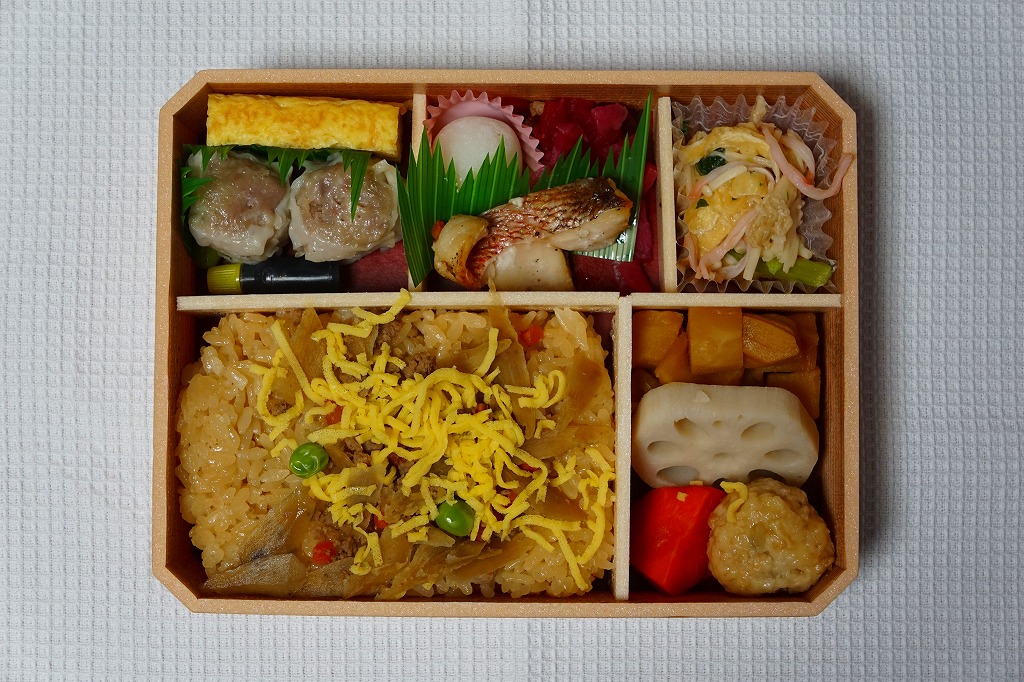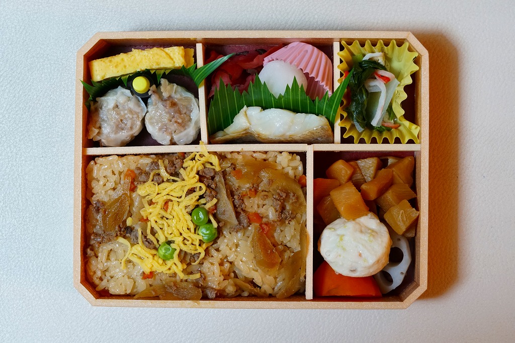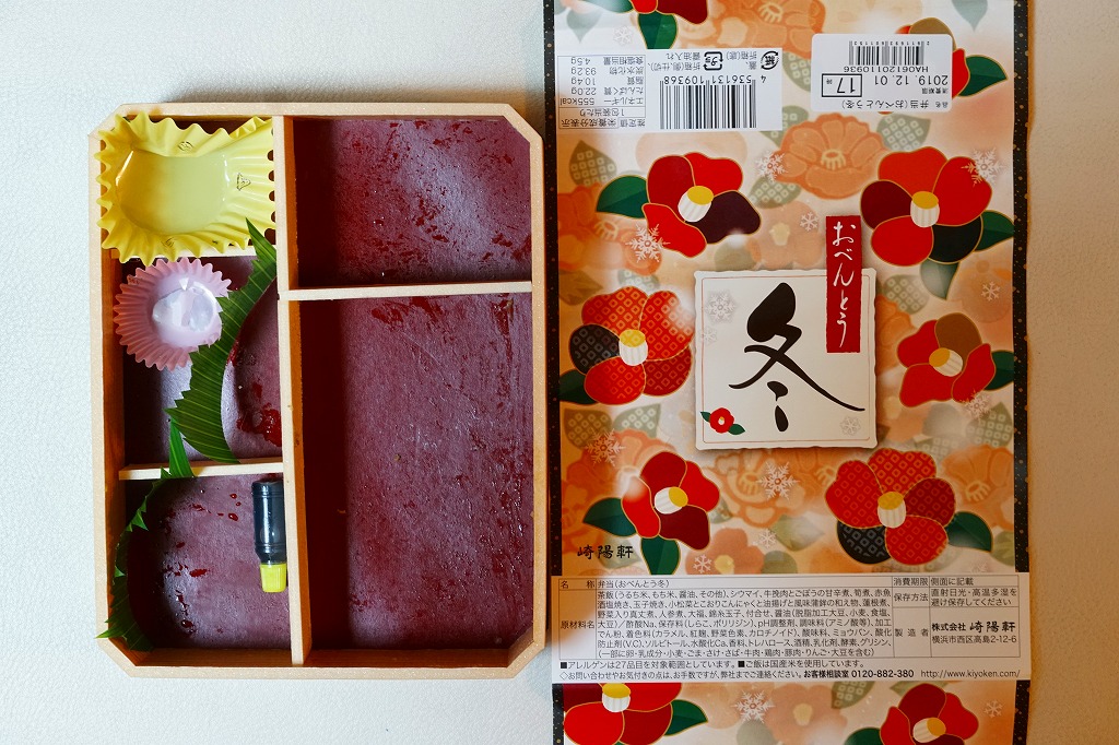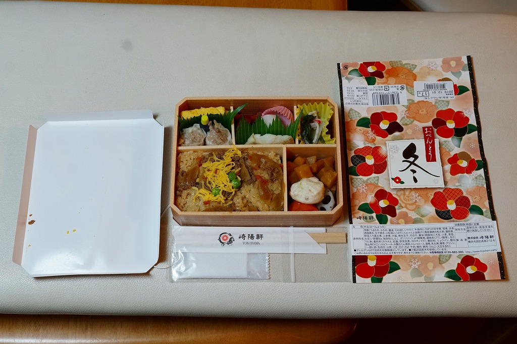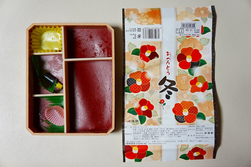 2003(平成15)年12月に初めて販売した、横浜駅の冬駅弁「おべんとう冬」の2019(令和元)年版で、12月1日から1月31日までの販売。今回も印象は似るが中身は少し変わり、牛そぼろとごぼうの甘辛煮の茶飯に、赤魚の酒塩焼き、野菜のしんじょう、こおりこんにゃくと小松菜とカニ風味蒲鉾と油揚げの和え物、レンコンとニンジンの煮物、タケノコ煮、玉子焼、しば大根漬け、小粒大福、シウマイ2個。