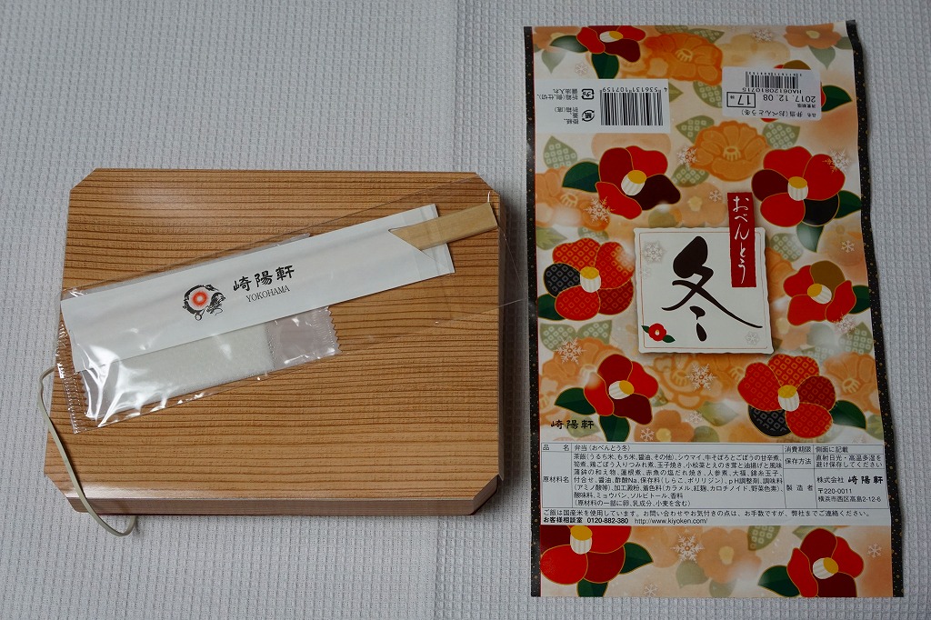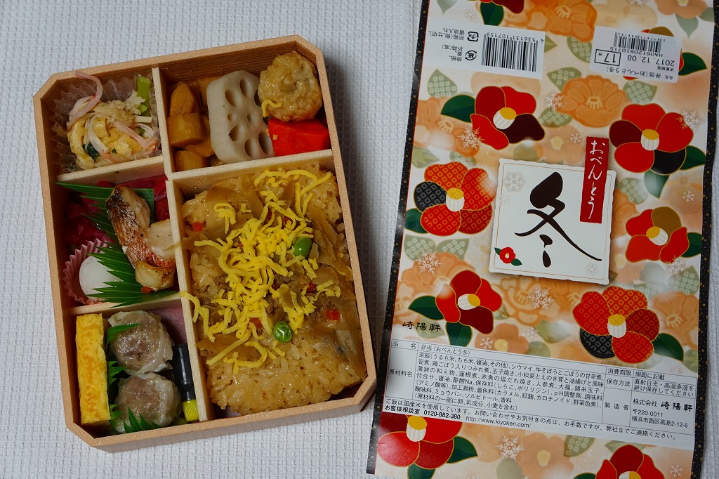 2003(平成15)年12月に初めて販売した、横浜駅の冬駅弁「おべんとう冬」の2017(平成29)年版で、12月1日から1月31日までの販売。価格と容器は前年と同じで、掛紙の文字が凜々しくなった。中身はシウマイの位置が変わった以外はおおむね同じで、牛そぼろとごぼうの甘辛煮の茶飯に、赤魚の塩だれ焼き、ごぼう入りつみれのしょう油あんかけ、小松菜とカニ風味蒲鉾とえのきと油揚げの和え物、レンコンとニンジンの煮物、タケノコ煮、玉子焼、しば大根漬け、小粒大福、シウマイ2個。