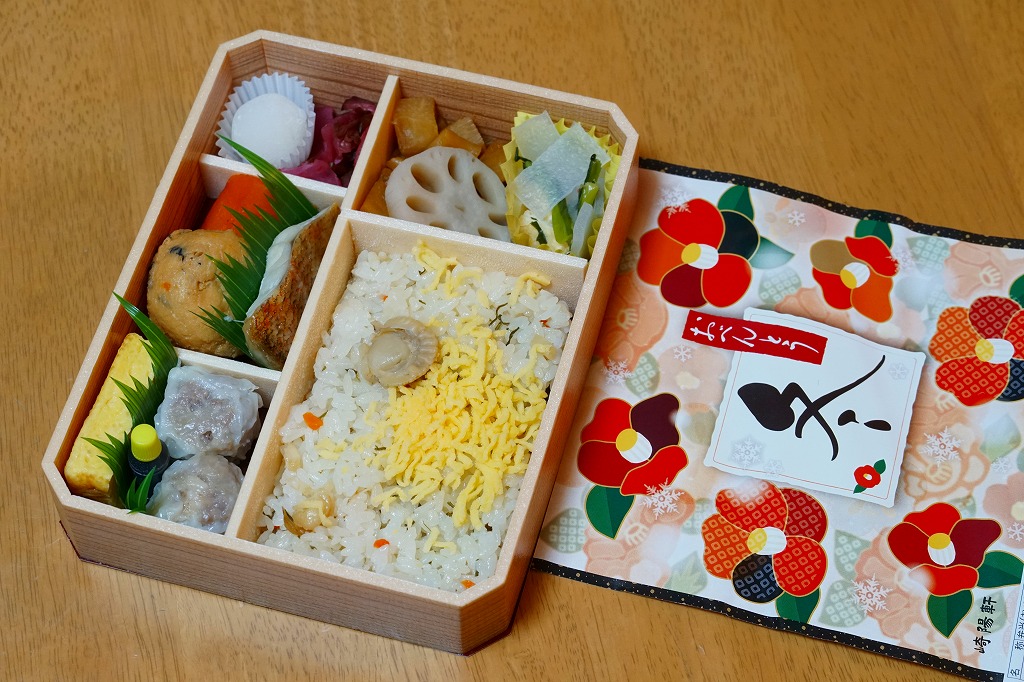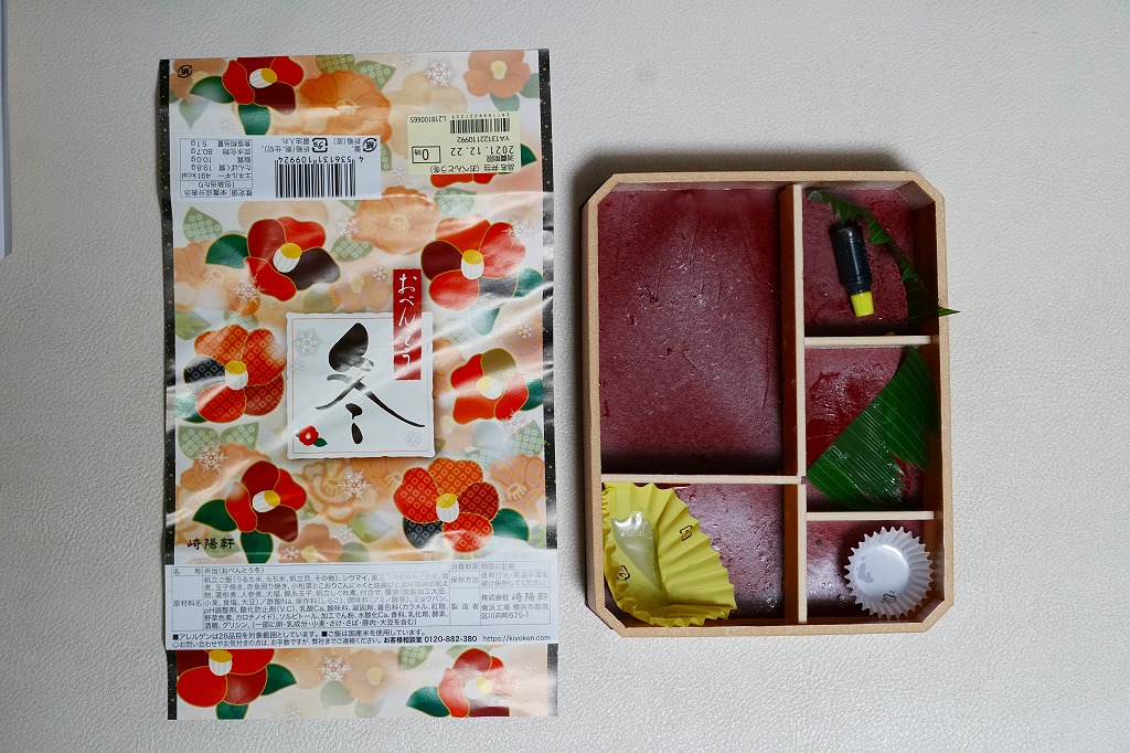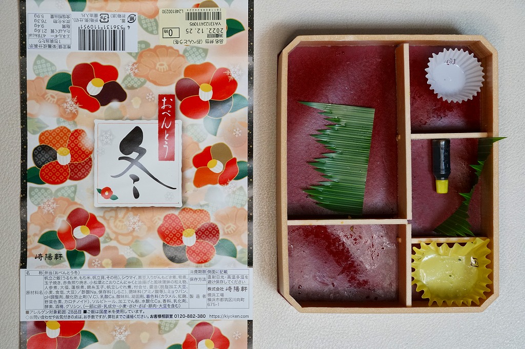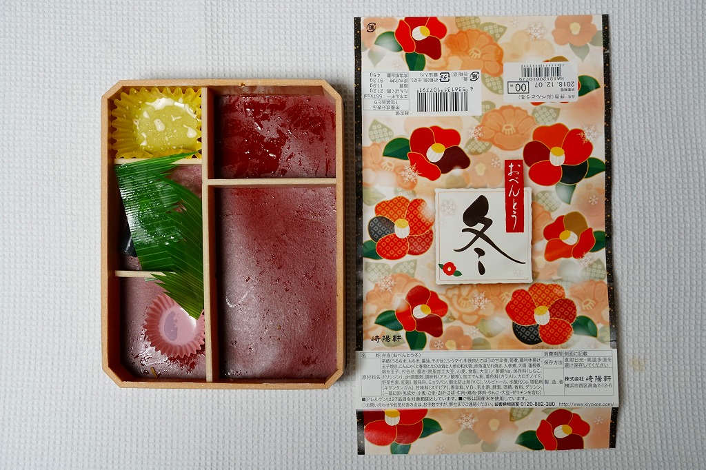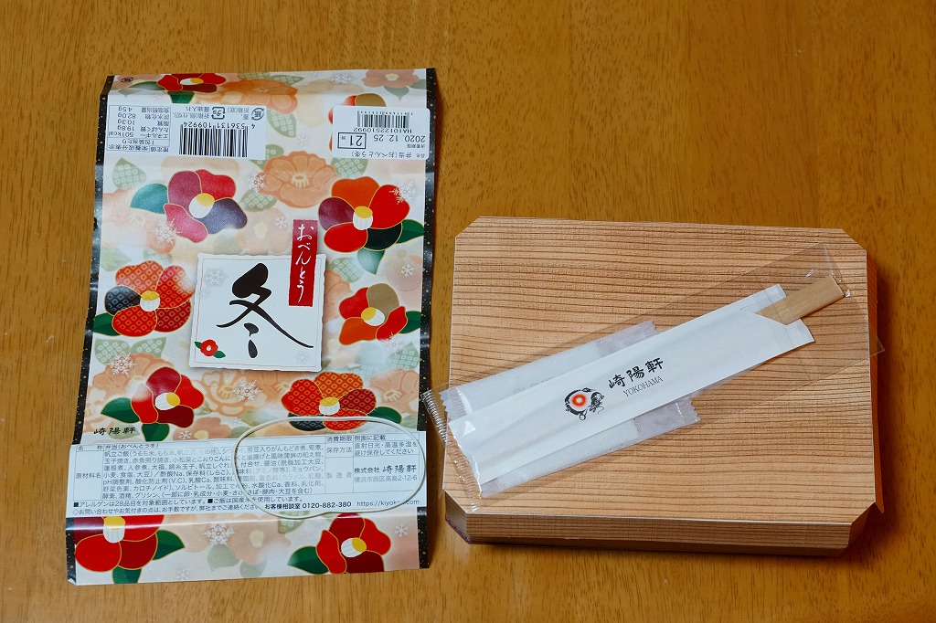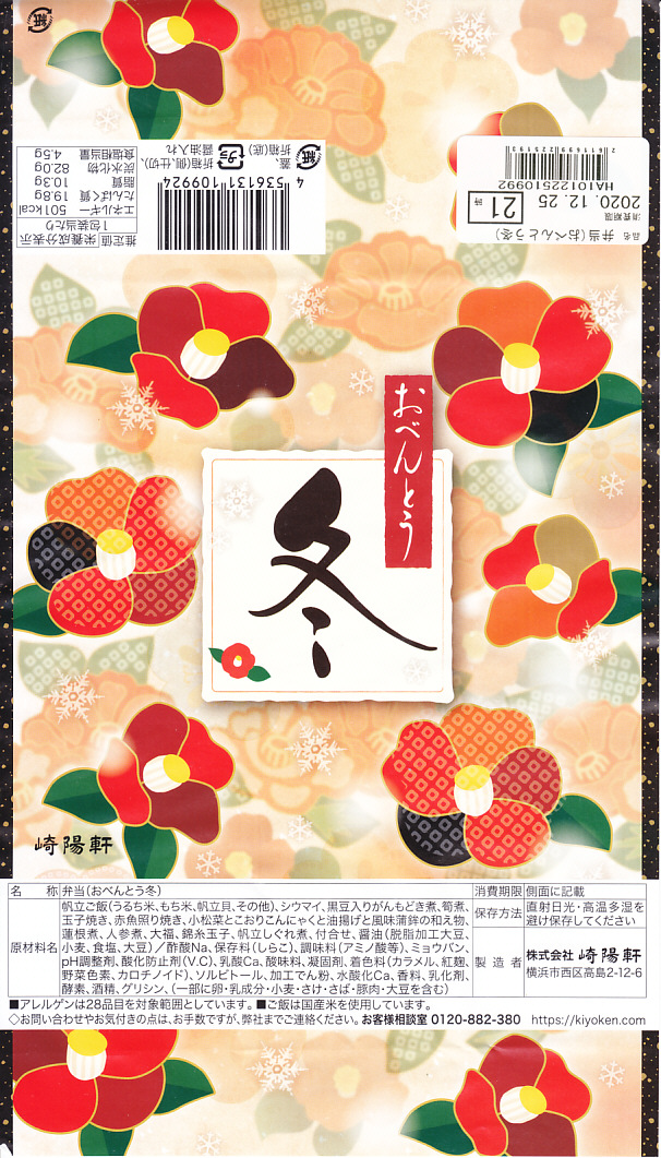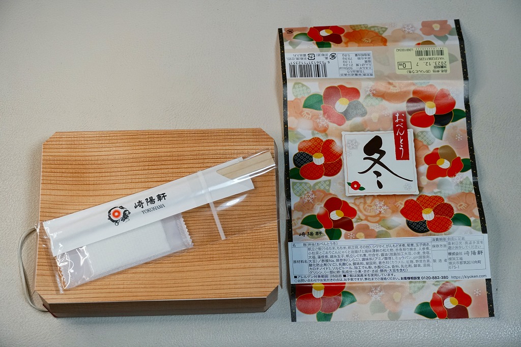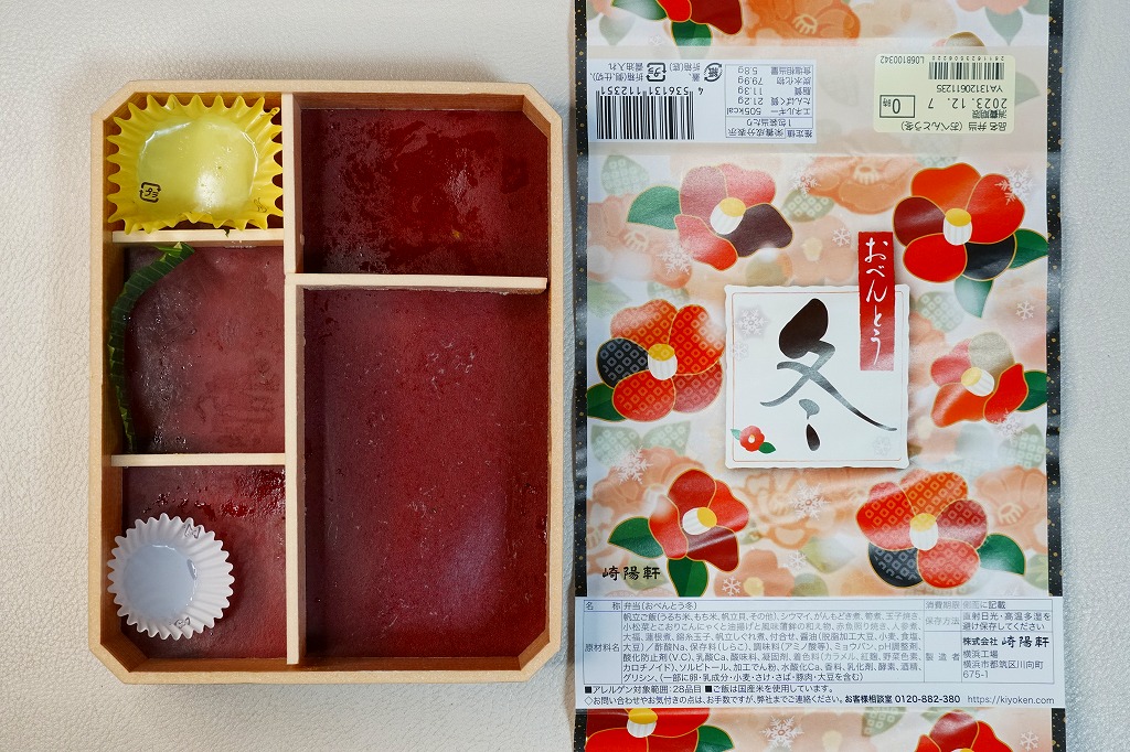 2003(平成15)年12月に初めて販売した、横浜駅の冬駅弁「おべんとう冬」の2022(令和4)年度版で、12月1日から1月31日までの販売。掛紙のツバキの絵柄も容器も内容も、3年連続で据え置かれた。中身は帆立御飯、赤魚の照焼、黒豆入りがんもどき煮、こおりこんにゃくと小松菜とカニ風味蒲鉾と油揚げの和え物、レンコンとニンジンの煮物、タケノコ煮、玉子焼、しば大根漬け、小粒大福、シウマイ2個。価格は30円のアップ。