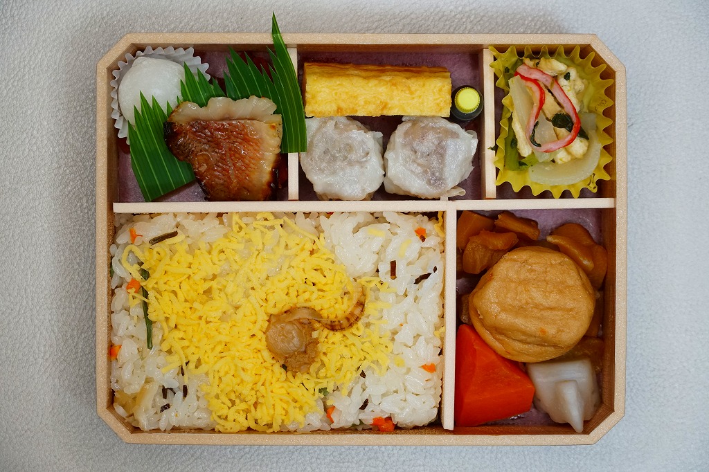 2003(平成15)年12月に初めて販売した、横浜駅の冬駅弁「おべんとう冬」の2023(令和5)年度版で、12月1日から1月31日までの販売。掛紙のツバキの絵柄も容器も内容も、4年連続で据え置かれた。中身は帆立御飯、赤魚の照焼、がんもどき煮、こおりこんにゃくと小松菜風味蒲鉾と油揚げの和え物、レンコンとニンジンの煮物、タケノコ煮、玉子焼、しば大根漬け、小粒大福、シウマイ2個。価格は50円のアップ。