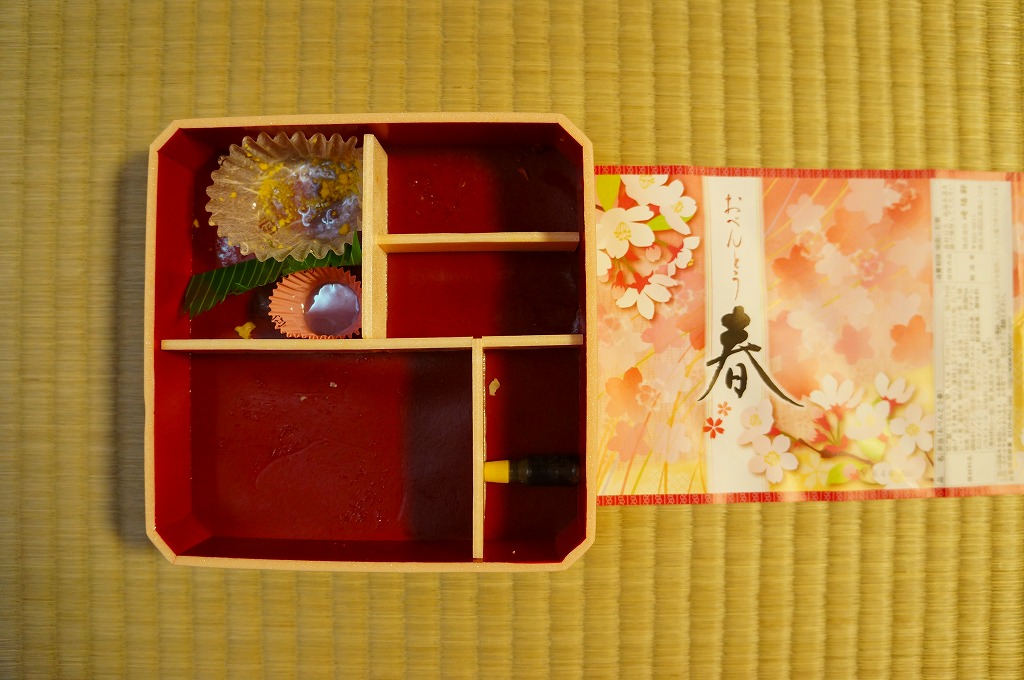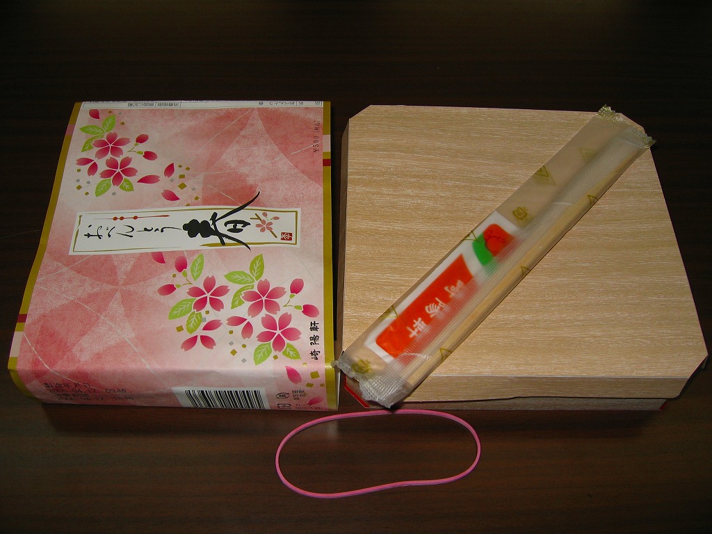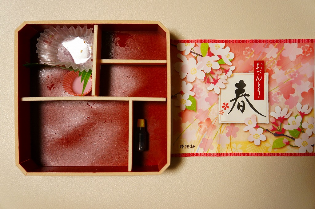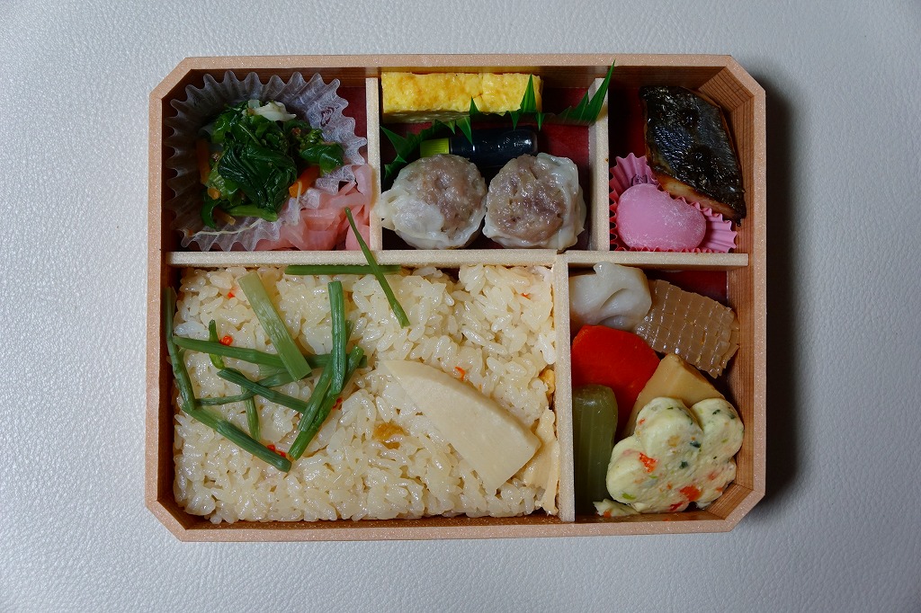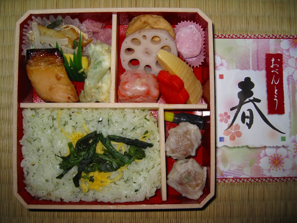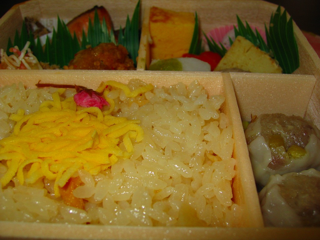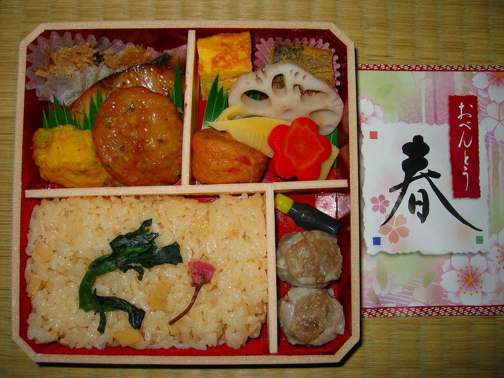 1998(平成10)年に発売された、小柄で安価な横浜駅の春駅弁。これは2012(平成24)年版で、2月から4月までの販売。今回の内容はタケノコ御飯にマス照焼、鶏利休揚、花形しんじょ、タケノコやニンジンなどの煮物、せりと蒲鉾と玉子そぼろの和え物、シウマイ2個、玉子焼、大根桜漬、桜あんの小粒大福。いつもの良いものを出してきている。淡い黄色や赤色が随所に表現される点も春らしい。