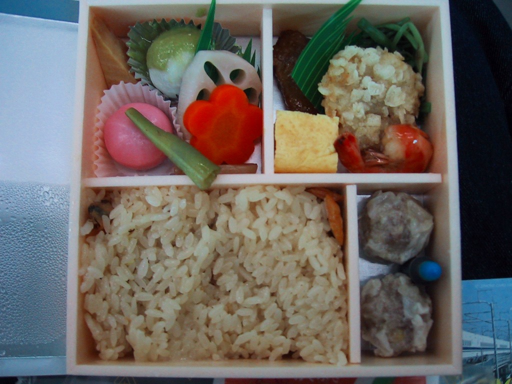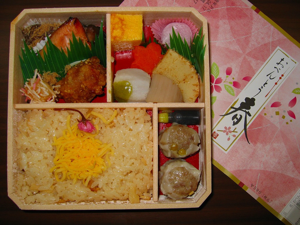 横浜駅などで1月から5月まで売られる、春季限定の駅弁。写真は2002(平成14)年版で、春らしい桜色の掛紙をかけた小ぶりな正方形の容器の中身は、あさり御飯とシウマイ2個、筍や人参の煮物に海老や玉子焼、そして白身魚のかけらもち揚げなど。一品一品が小ぶりながら素材の味を生かしていて高級感がある、量も風味も女性向けの駅弁。