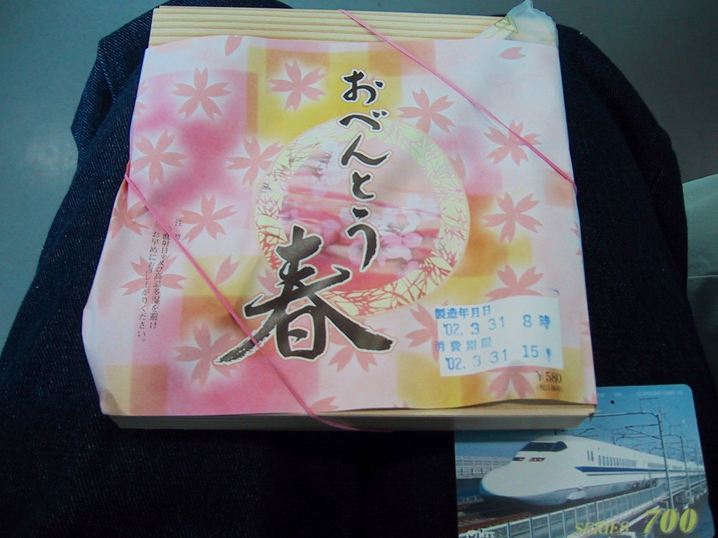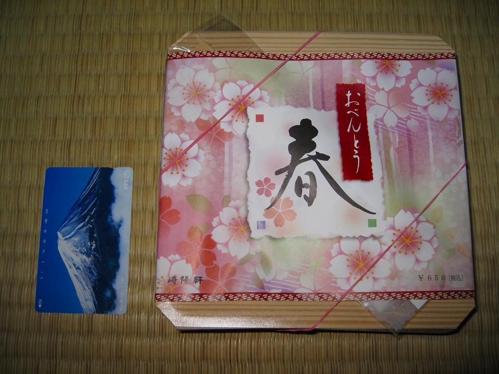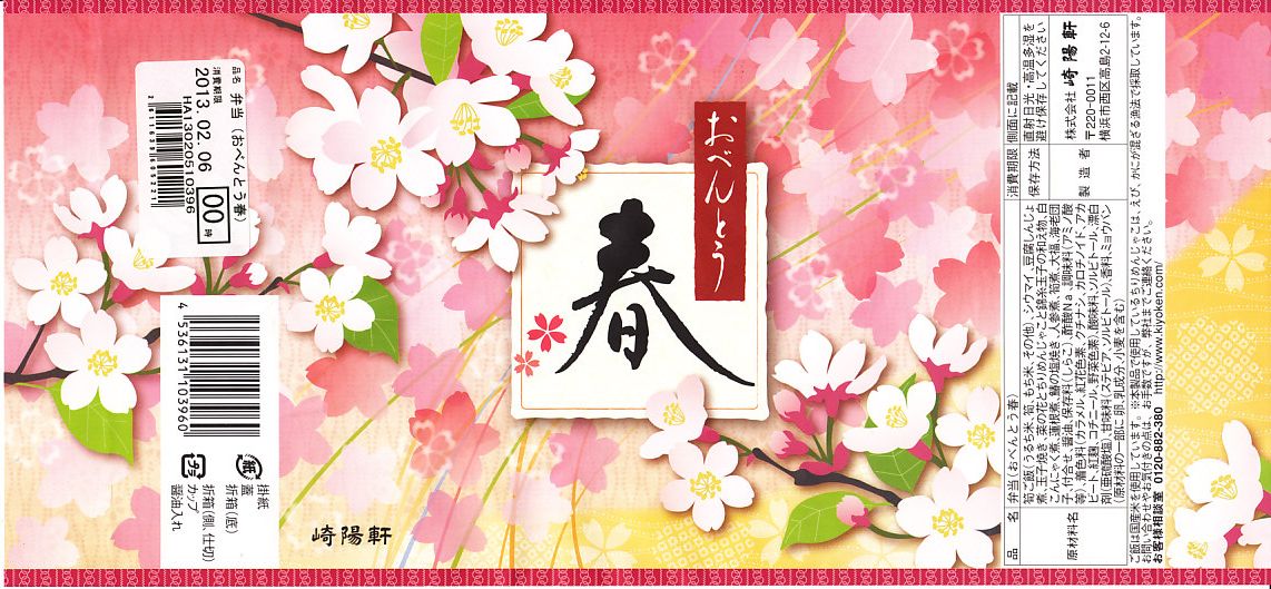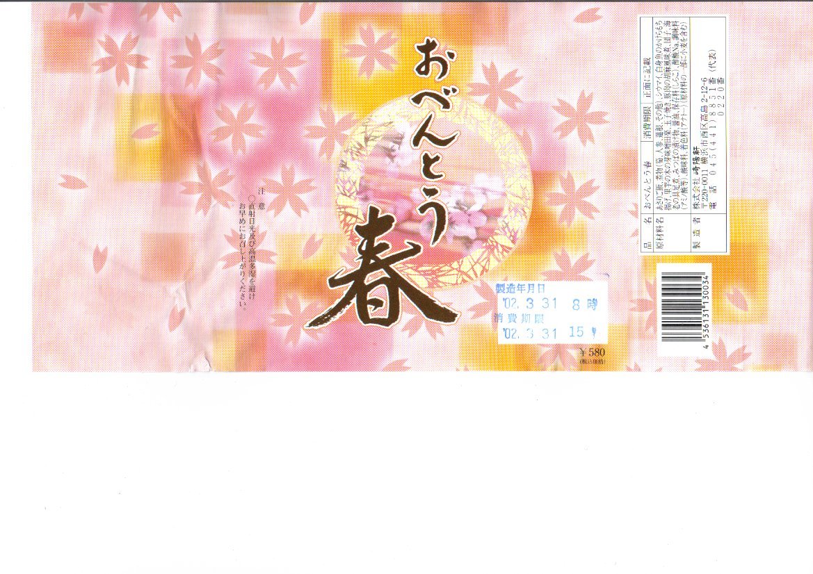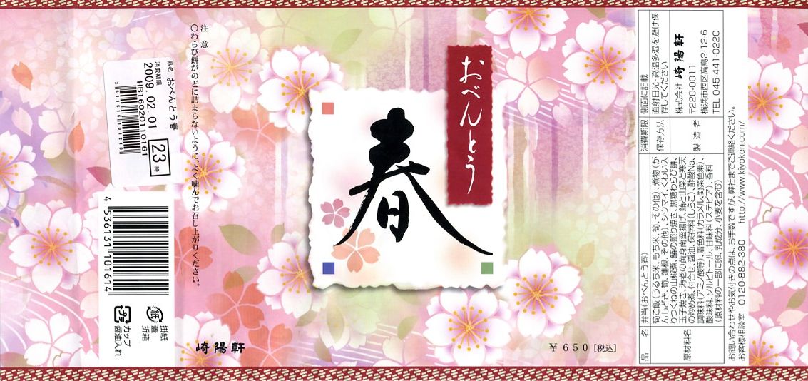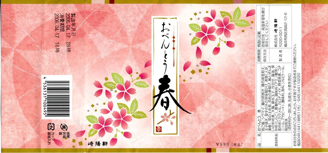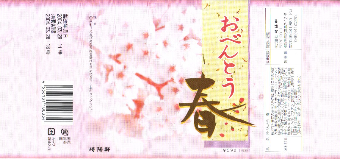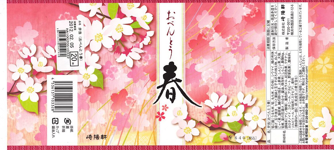 1998(平成10)年に発売された、小柄で安価な横浜駅の春駅弁。これは2004(平成16)年版。以前と比較して、「おべんとう冬」の発売により販売期間が1か月繰り下げの2月から5月までとなり、価格が今期から10円アップ。その他の基本的なところは変わらず、春らしさと横浜らしさを演出した、量も風味も女性向けの駅弁。この季節駅弁はメディアでもよく紹介され、横浜駅で「シウマイ御弁當」に次ぐナンバー2の地位を確保した感じ。