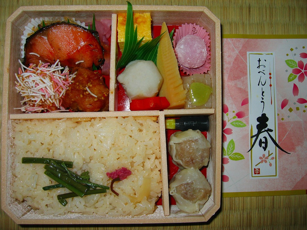 1998(平成10)年に発売された、小柄で安価な横浜駅の春駅弁。これは2014(平成26)年版で、2月1日から4月15日頃までの販売。今回の内容は山菜御飯、サワラ塩焼、タケノコやニンジンやレンコンなどの煮物、菜の花とニンジンとちりめんじゃこの和え物、玉子焼、桜大根、桜ミニ大福、シウマイ2個。掛紙の絵柄も含めて、前年とちょっとだけ違う。