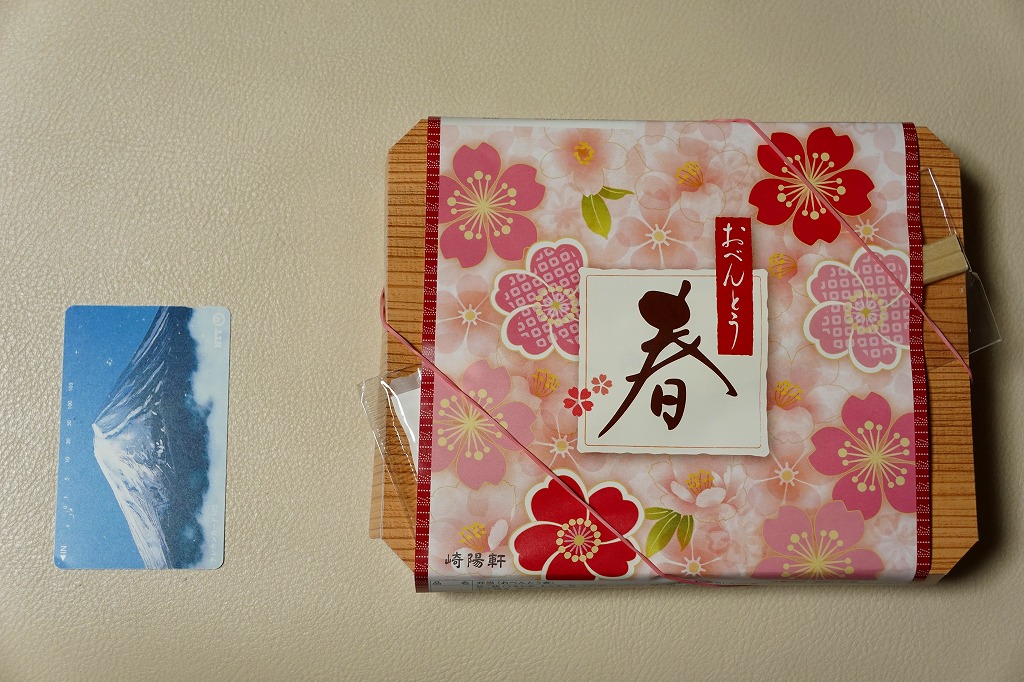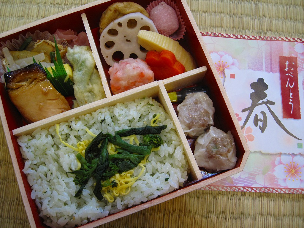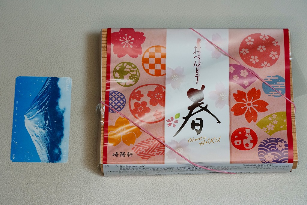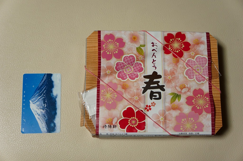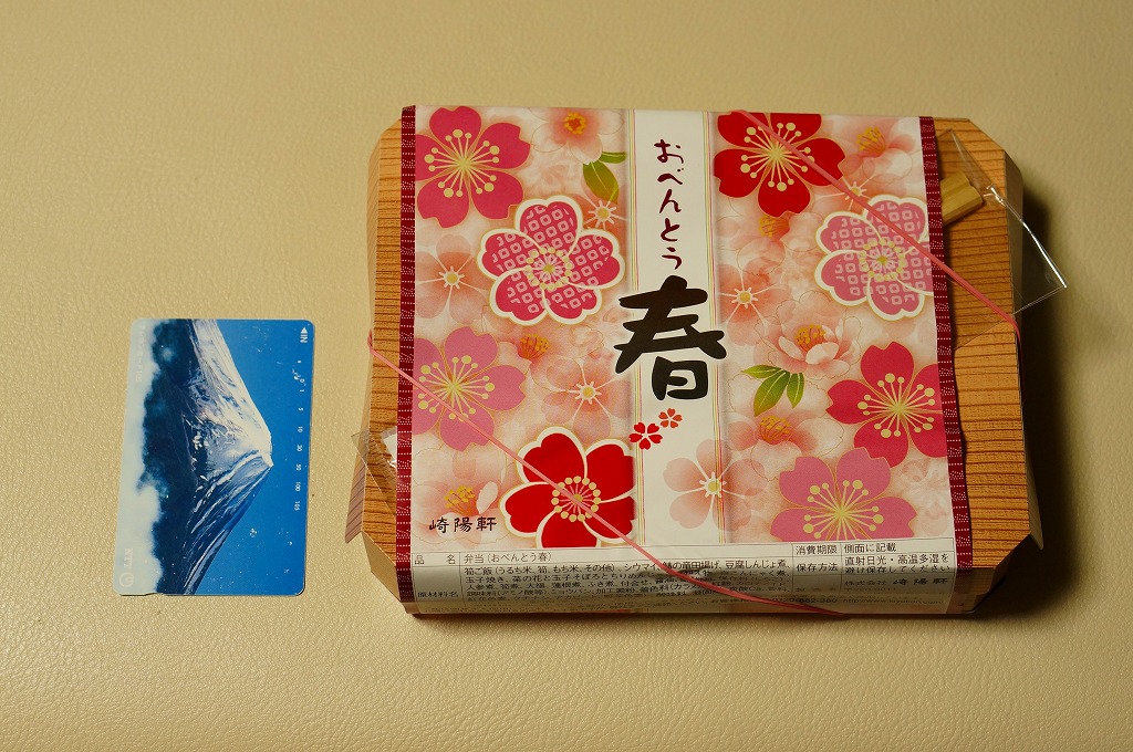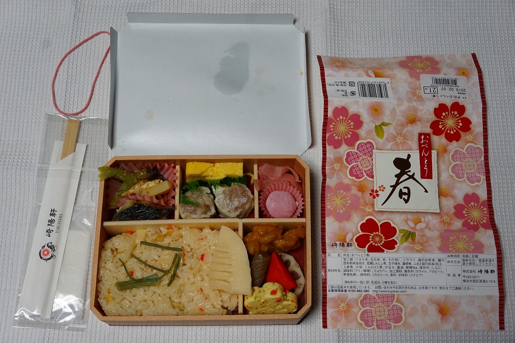 1998(平成10)年に発売された、小柄で安価な横浜駅の春駅弁。これは2010(平成22)年版で、2月から5月までの販売。今回の内容は菜の花御飯にサワラ照焼、タラの芽の天ぷら、エビボール、タケノコやレンコンなどの煮物、鶏肉と山菜などの炒め煮、シウマイ2個、桜大福。