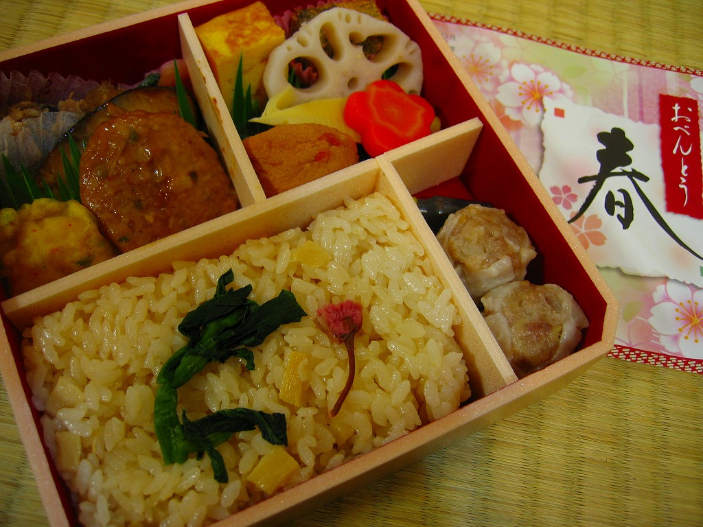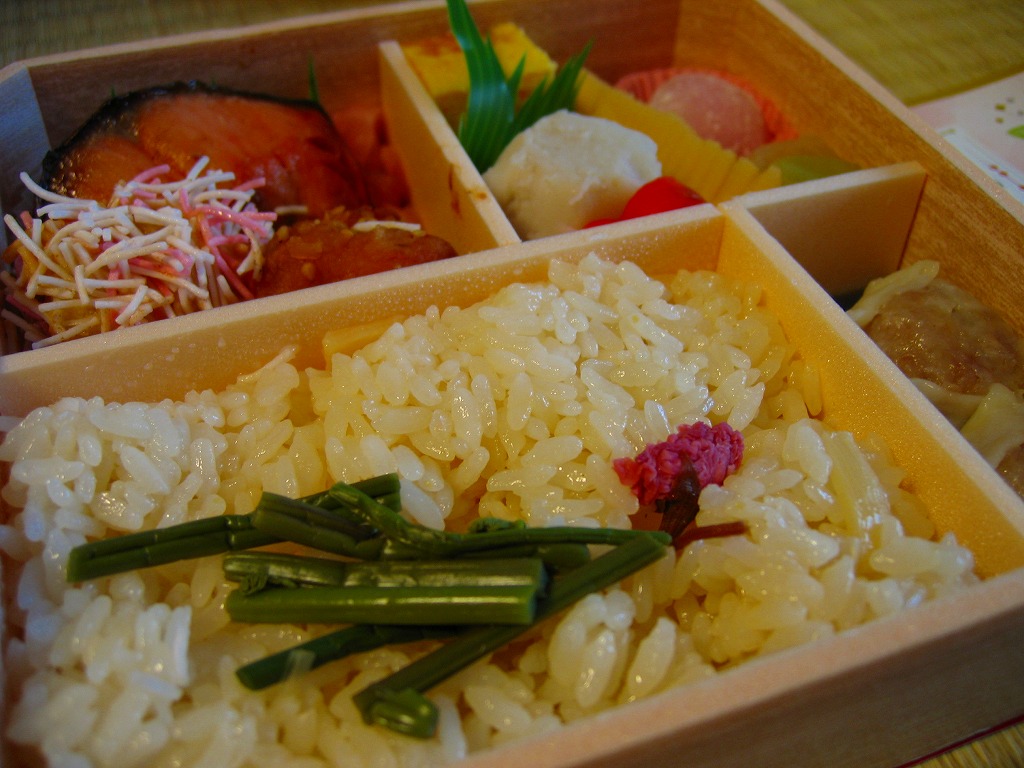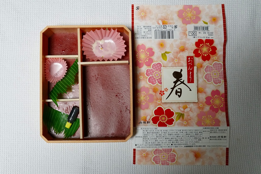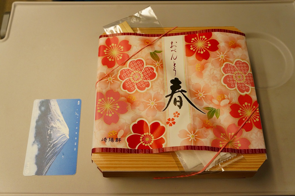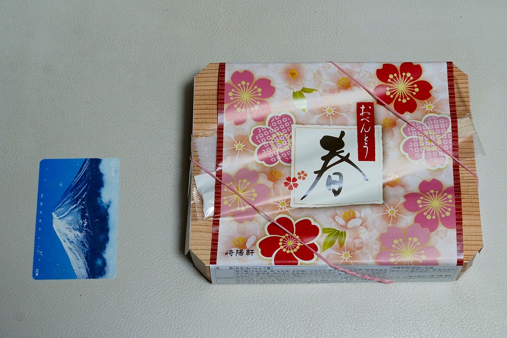 1998(平成10)年に発売された、小柄で安価な横浜駅の春駅弁。これは2010(平成22)年版で、2月から5月までの販売。今回の内容は菜の花御飯にサワラ照焼、タラの芽の天ぷら、エビボール、タケノコやレンコンなどの煮物、鶏肉と山菜などの炒め煮、シウマイ2個、桜大福。