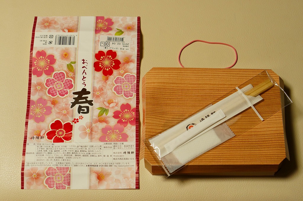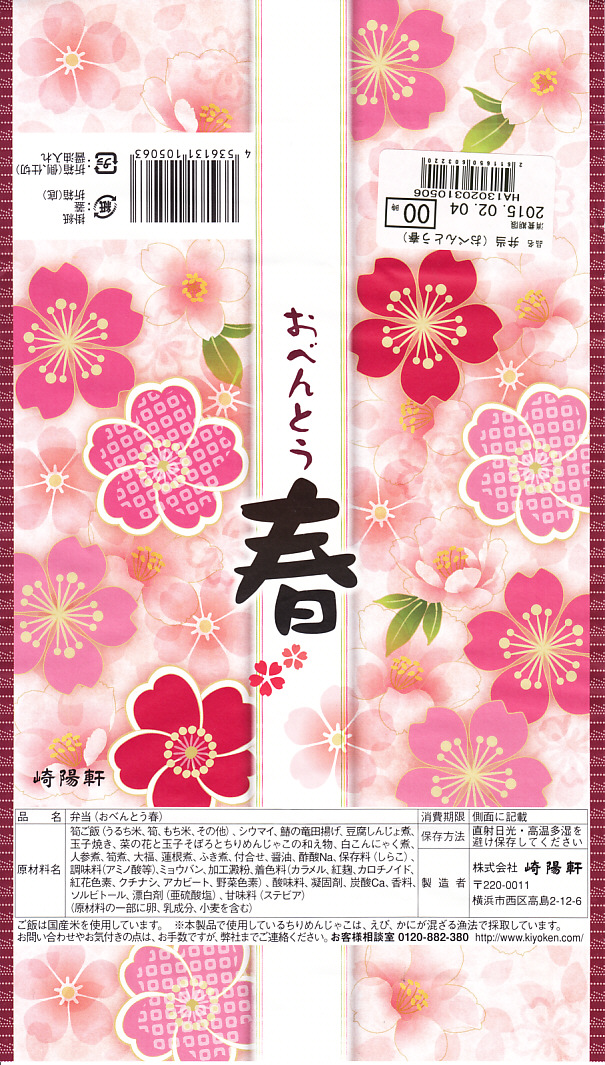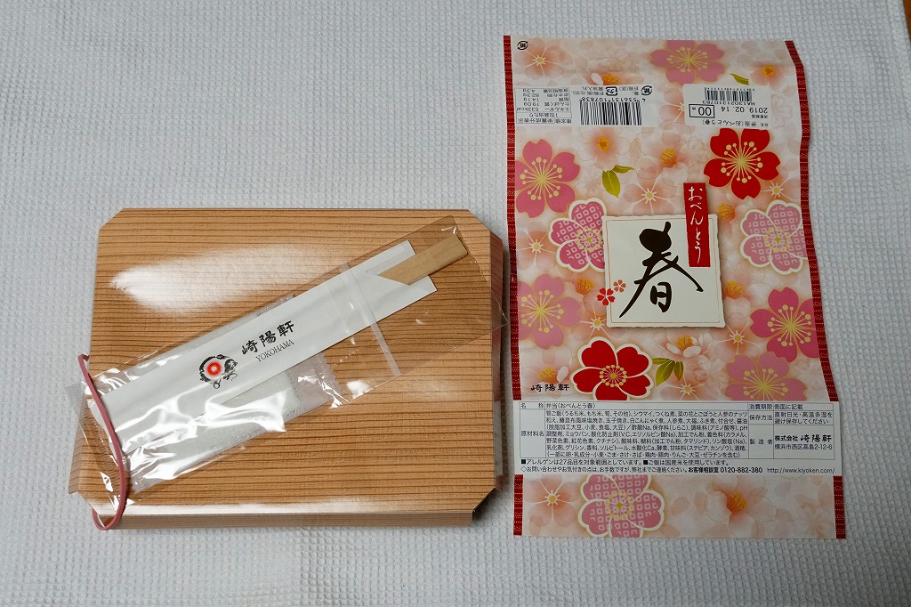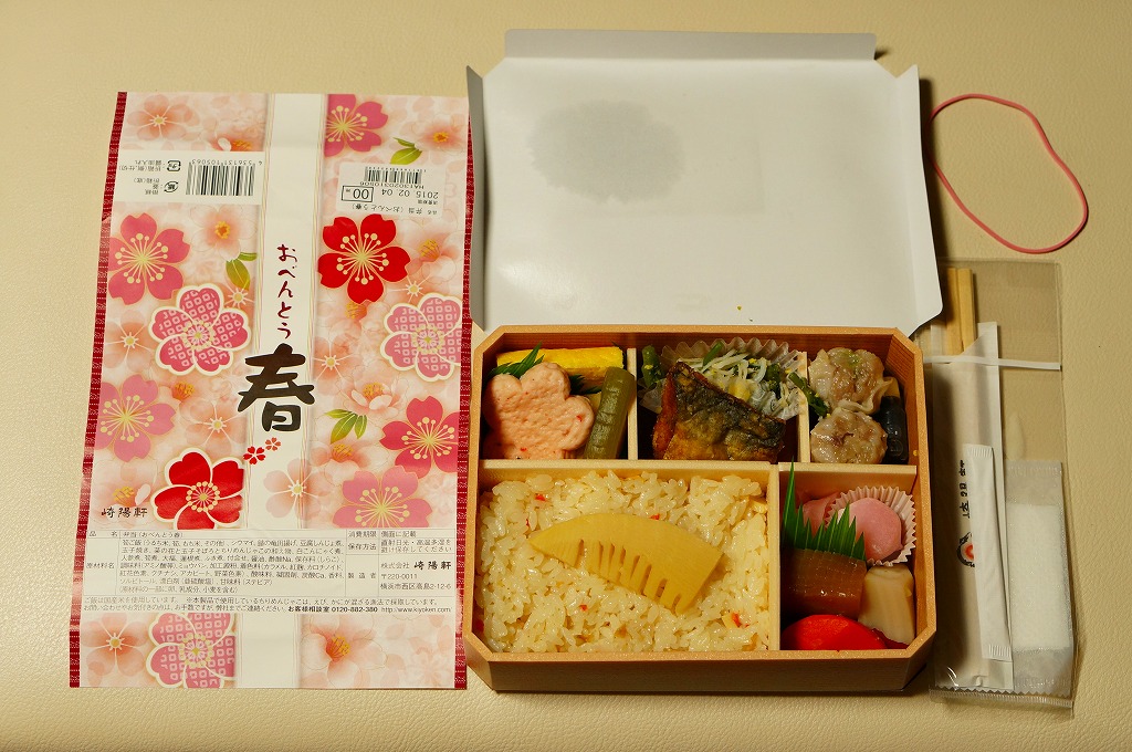 1998(平成10)年に発売された、小柄で安価な横浜駅の春駅弁。これは2015(平成27)年版で、2月1日から4月15日頃までの販売。前年秋の「おべんとう秋」からのものと同じく、容器が横に、掛紙が縦に長くなった。今回の内容はタケノコ御飯、サワラ竜田揚、ニンジンやレンコンなどの煮物、菜の花と玉子そぼろとちりめんじゃこの和え物、玉子焼、桜大根、桜ミニ大福、シウマイ2個。彩りや詰め方の違いもあり、なんとなく内容がスッキリしたように思えた。消費税率アップの影響か、価格は30円の値上げ。
