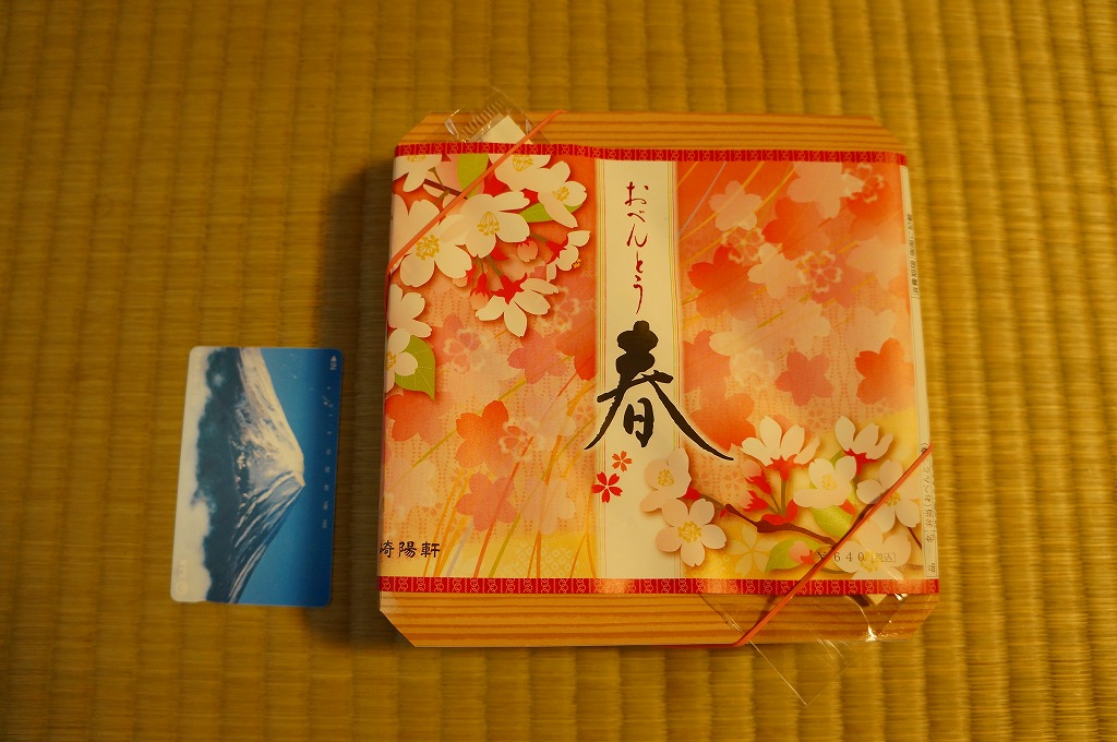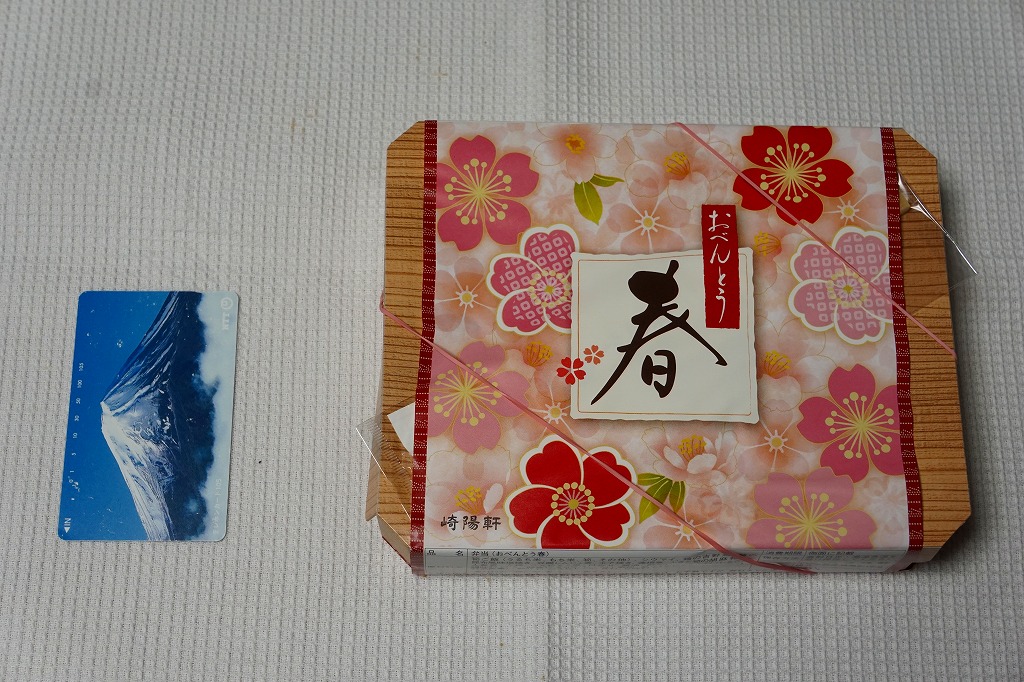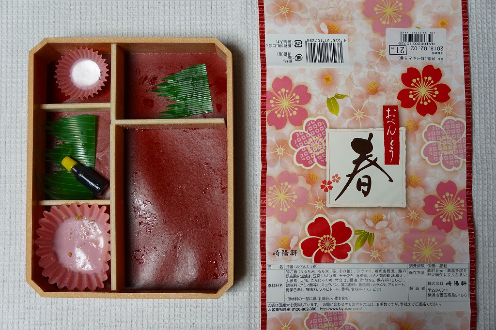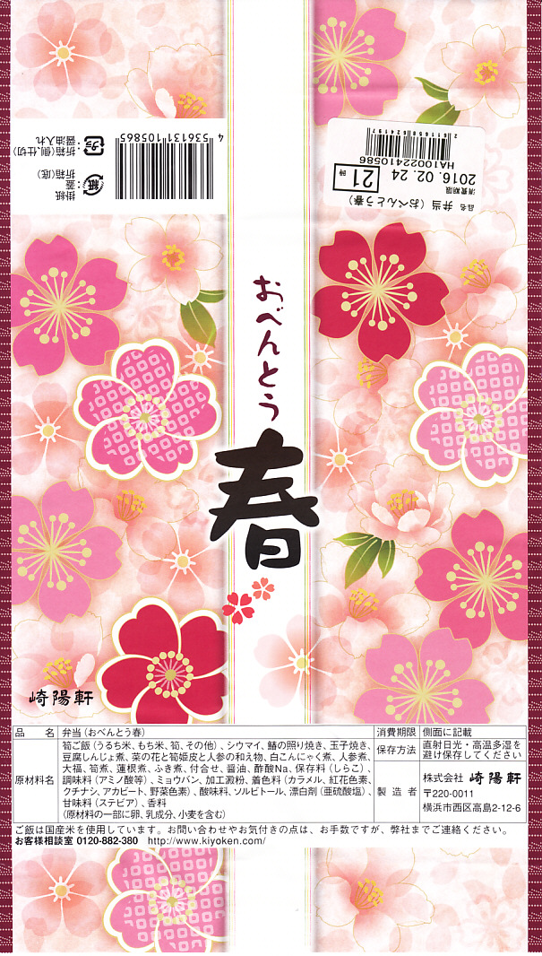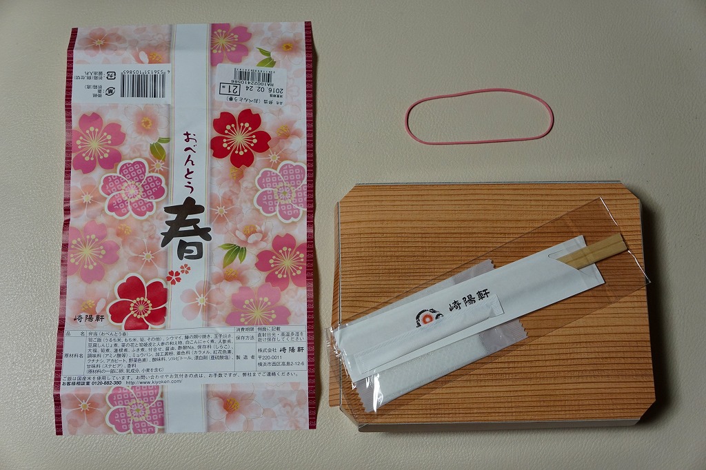 1998(平成10)年に発売された、小柄で安価な横浜駅の春駅弁。これは2015(平成27)年版で、2月1日から4月15日頃までの販売。前年秋の「おべんとう秋」からのものと同じく、容器が横に、掛紙が縦に長くなった。今回の内容はタケノコ御飯、サワラ竜田揚、ニンジンやレンコンなどの煮物、菜の花と玉子そぼろとちりめんじゃこの和え物、玉子焼、桜大根、桜ミニ大福、シウマイ2個。彩りや詰め方の違いもあり、なんとなく内容がスッキリしたように思えた。消費税率アップの影響か、価格は30円の値上げ。