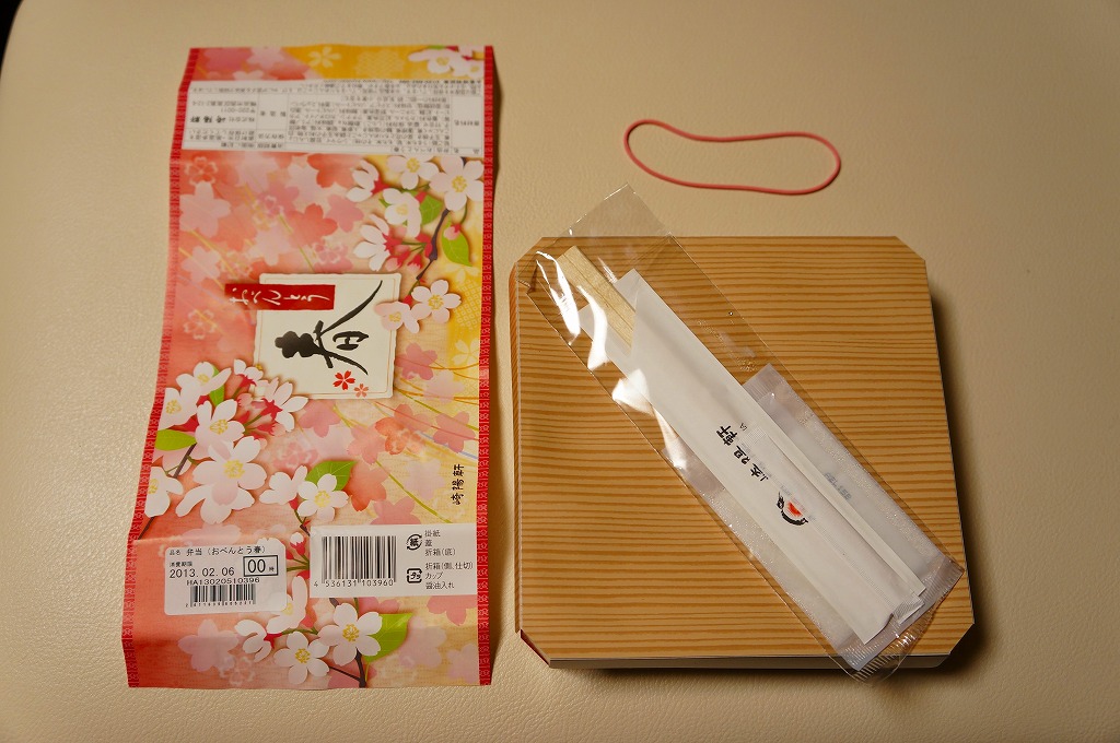 1998(平成10)年に発売された、小柄で安価な横浜駅の春駅弁。これは2013(平成25)年版で、2月から4月中旬までの販売。今回の内容はタケノコ御飯、サワラ塩焼、タケノコやニンジンやレンコンなどの煮物、菜の花とちりめんじゃこと錦糸玉子の和え物、玉子焼、桜大根、桜ミニ大福、シウマイ2個。つまりだいたい同じ。価格は10円のアップ。そして、掛紙から価格表示が消えている。