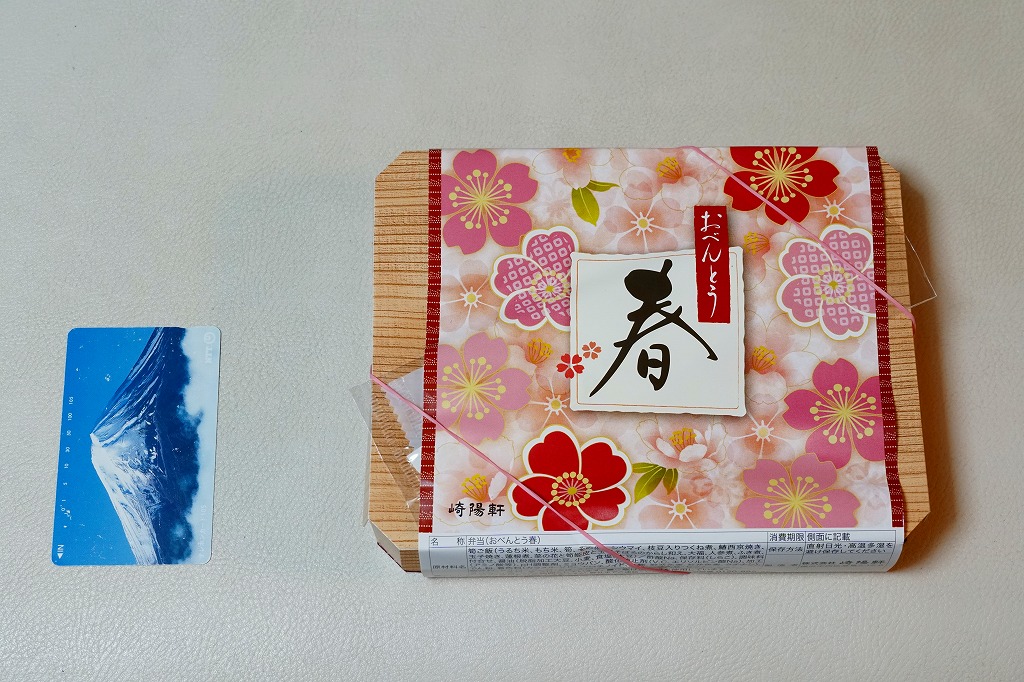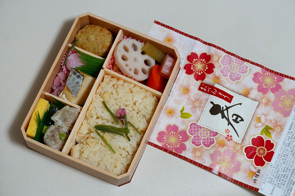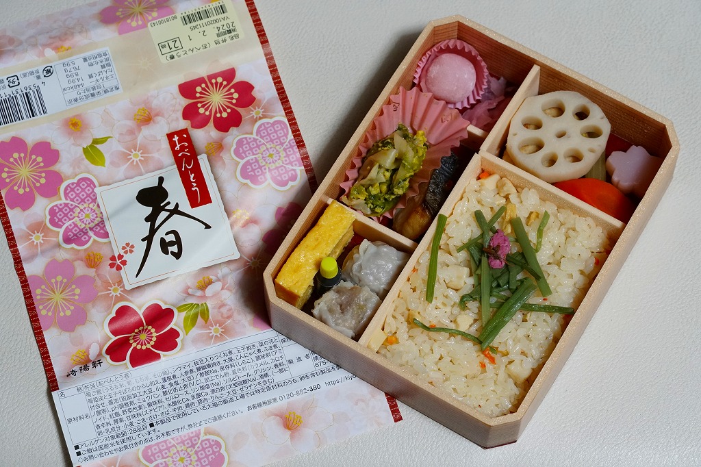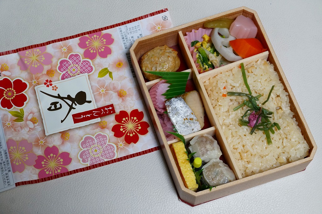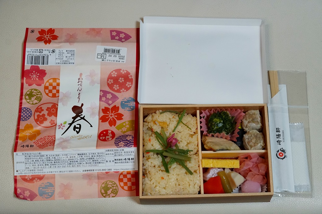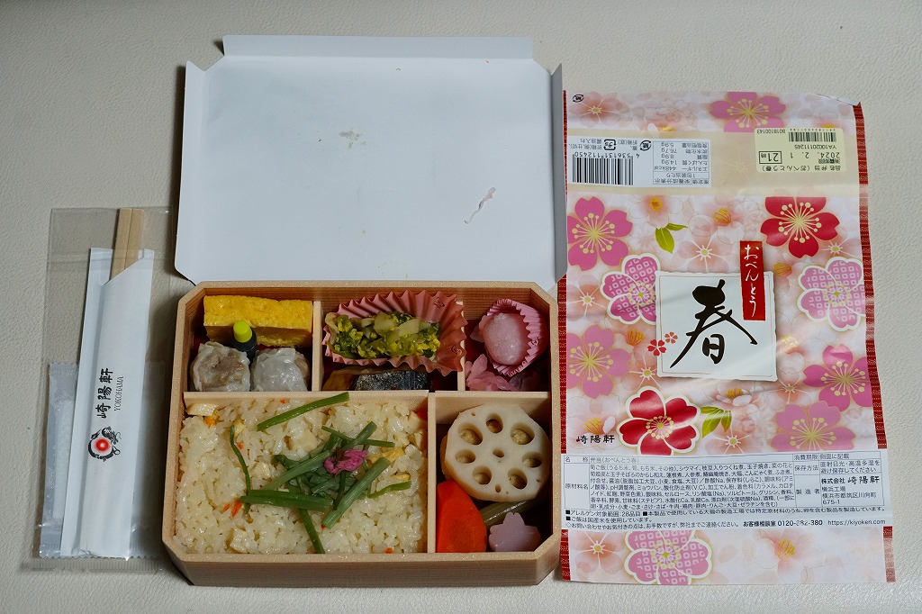 1998(平成10)年に発売された、小柄で安価な横浜駅の春駅弁。これは2024(令和6)年版で、2月1日から4月15日までの販売。春色と桜花でできている掛紙は、絵柄は2014(平成26)年から、形状は2017(平成29)年から変わらない。中身も前年と同じで、タケノコ御飯、サワラの幽庵焼き、彩りつくねの旨煮、ニンジンやフキやレンコンなどの煮物、菜の花やタケノコなどの辛子和え物、玉子焼、桜大根、桜ミニ大福、シウマイ2個。価格は60円アップ。