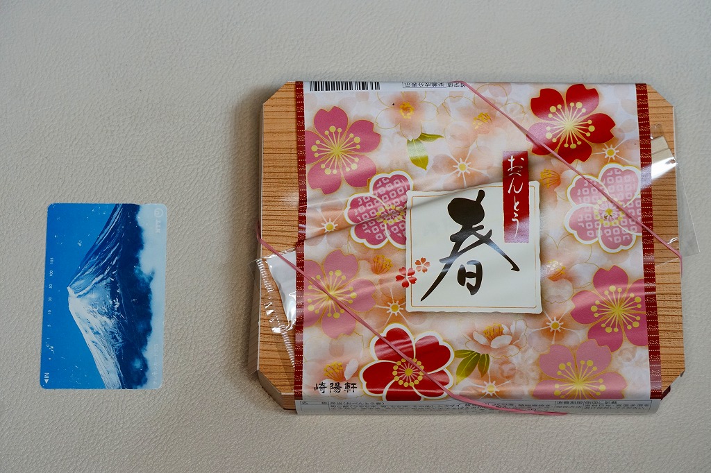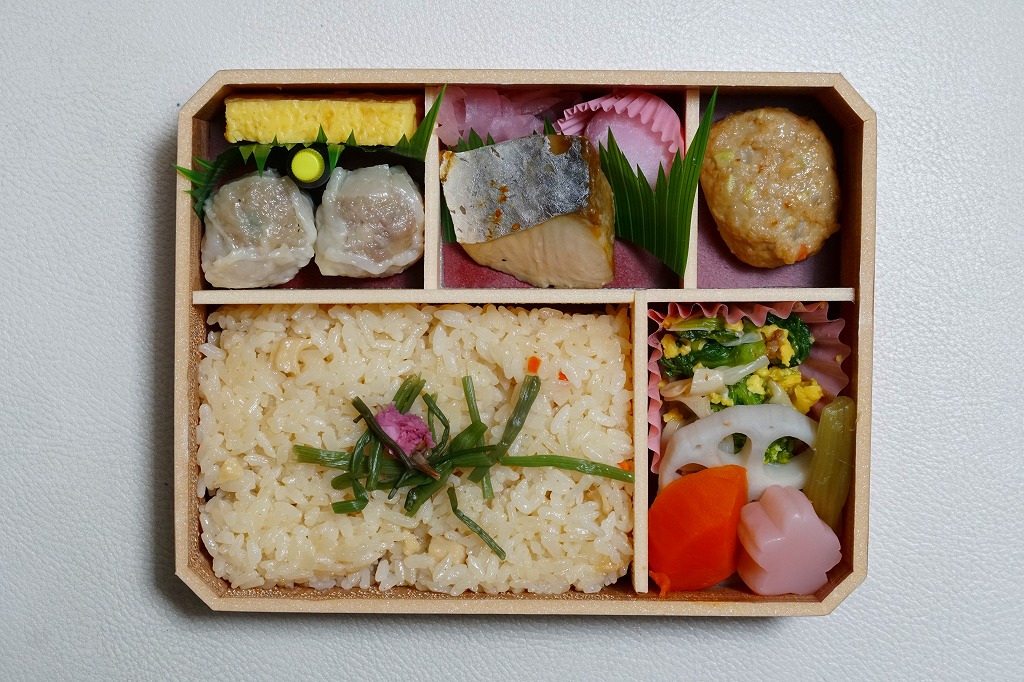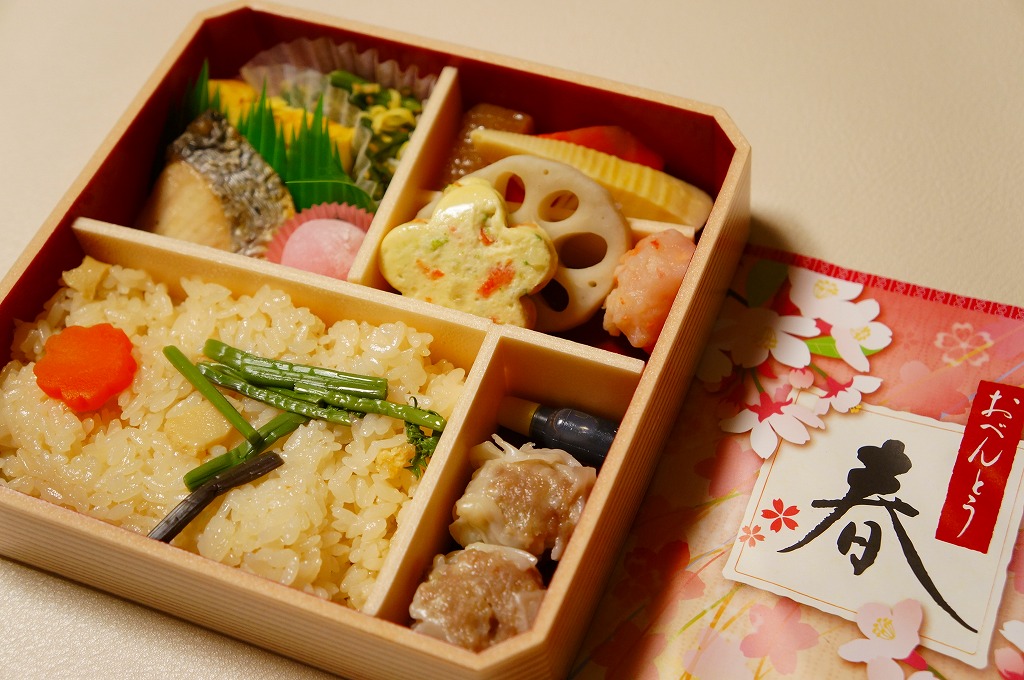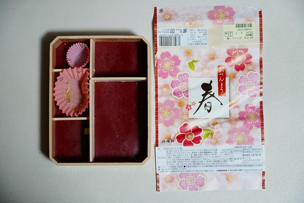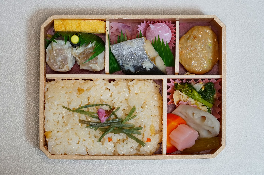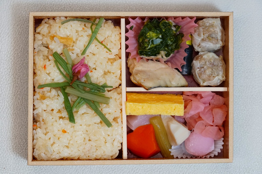 1998(平成10)年に発売された、小柄で安価な横浜駅の春駅弁。これは2024(令和6)年版で、2月1日から4月15日までの販売。春色と桜花でできている掛紙は、絵柄は2014(平成26)年から、形状は2017(平成29)年から変わらない。中身も前年と同じで、タケノコ御飯、サワラの幽庵焼き、彩りつくねの旨煮、ニンジンやフキやレンコンなどの煮物、菜の花やタケノコなどの辛子和え物、玉子焼、桜大根、桜ミニ大福、シウマイ2個。価格は60円アップ。