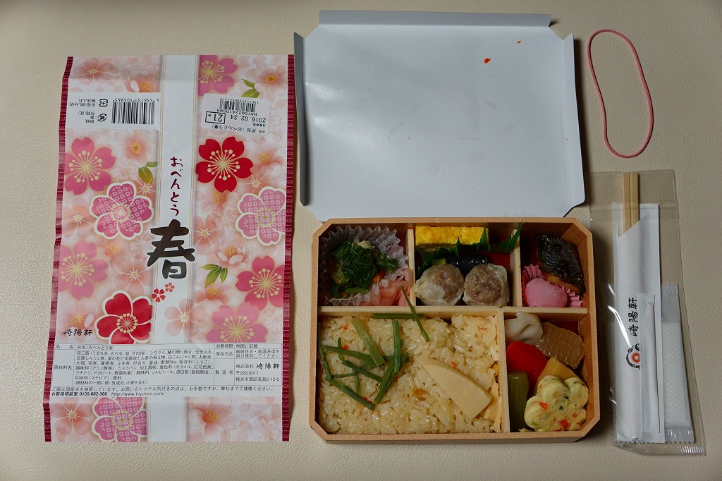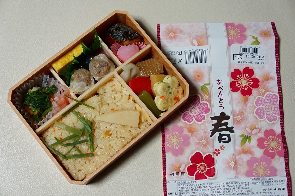 1998(平成10)年に発売された、小柄で安価な横浜駅の春駅弁。これは2016(平成28)年版で、2月1日から4月15日頃までの販売。今回の内容はタケノコ御飯、サワラ照焼、ニンジンやレンコンやタケノコなどの煮物、菜の花とタケノコとニンジンの和え物、玉子焼、桜大根、桜ミニ大福、シウマイ2個。写真で比べれば、おかずの配置がだいぶ変わったことに気が付くが、雰囲気としては引き続き、毎年同じ感じがする。