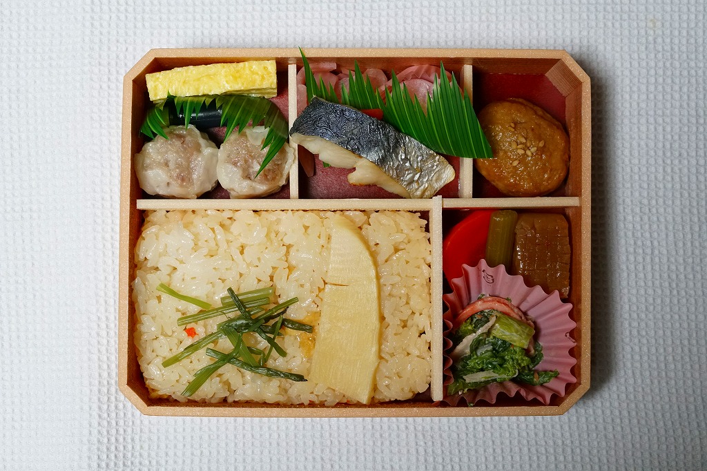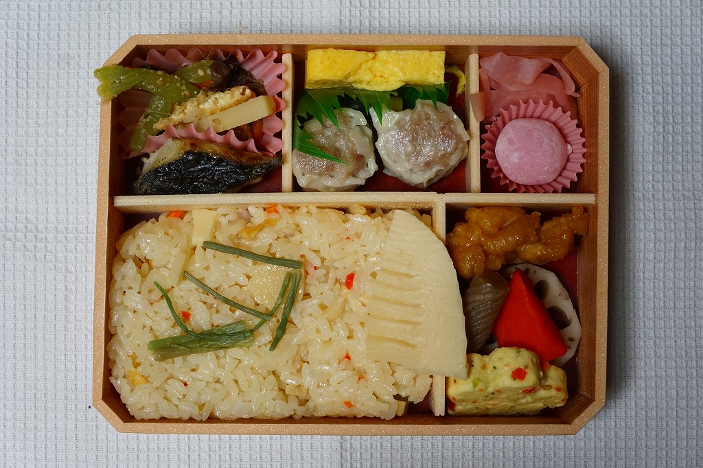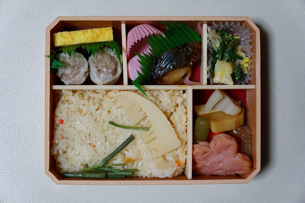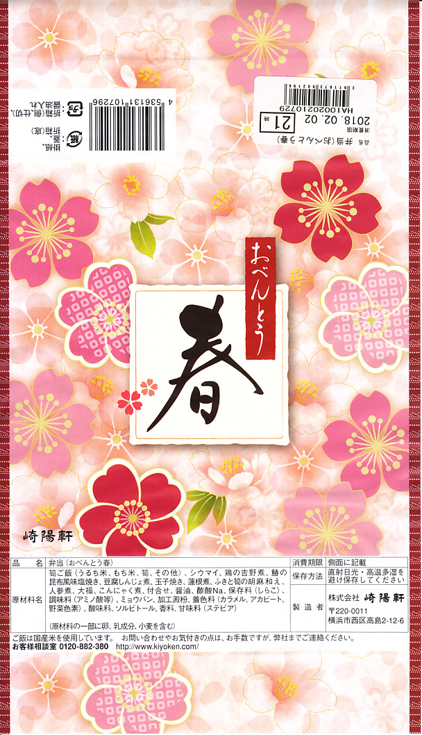 1998(平成10)年に発売された、小柄で安価な横浜駅の春駅弁。これは2017(平成29)年版で、2月1日から4月15日頃までの販売。今回の内容はタケノコ御飯、サワラ幽庵焼、ニンジンやレンコンやタケノコなどの煮物、菜の花とタケノコと玉子そぼろの和え物、玉子焼、桜大根、桜ミニ大福、シウマイ2個。掛紙の文字が固めになり、シウマイの位置が変わり、価格が20円上がったが、やはり雰囲気はほぼ変わらない。