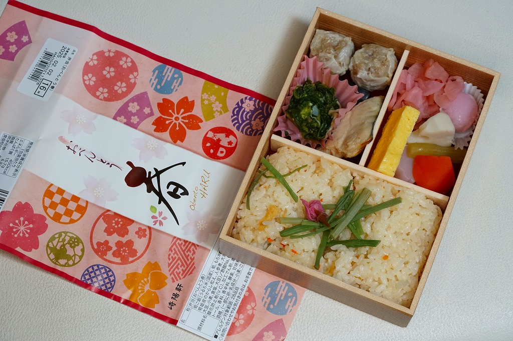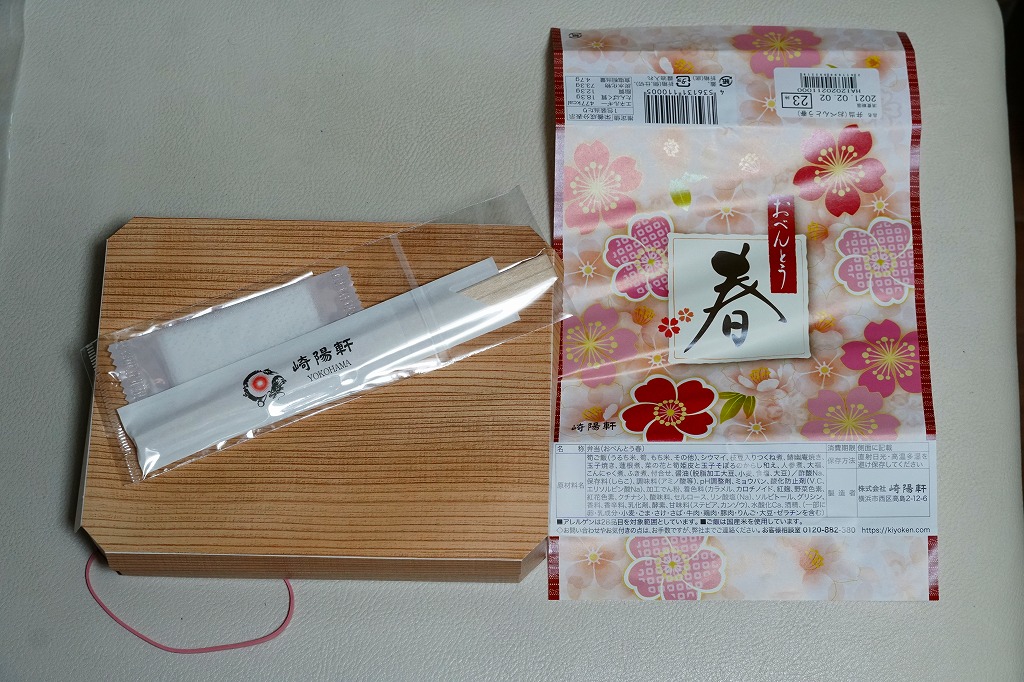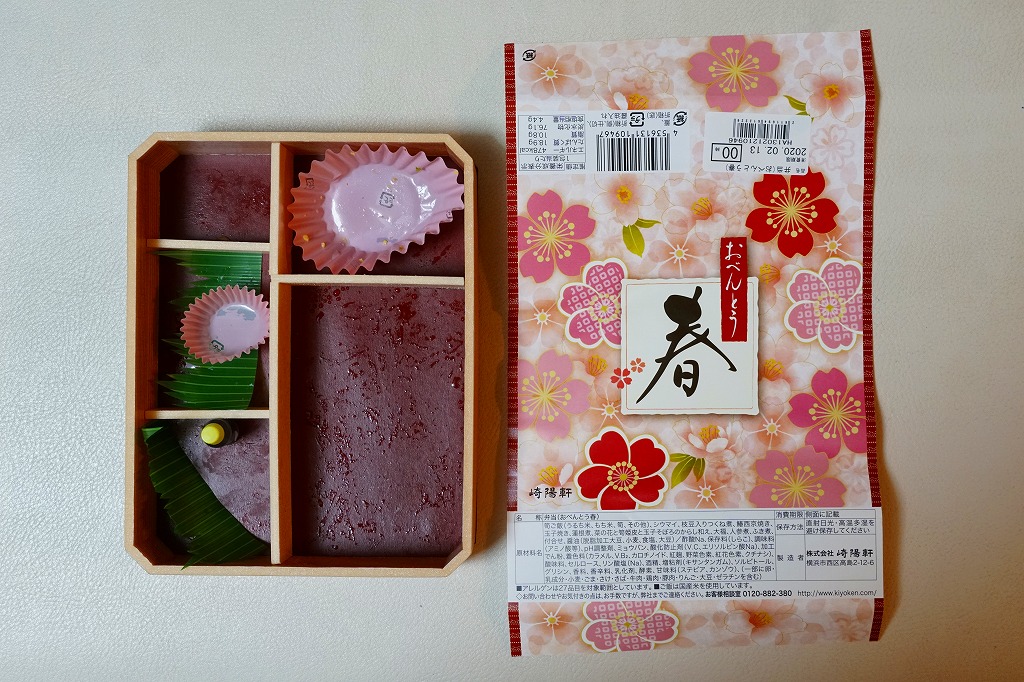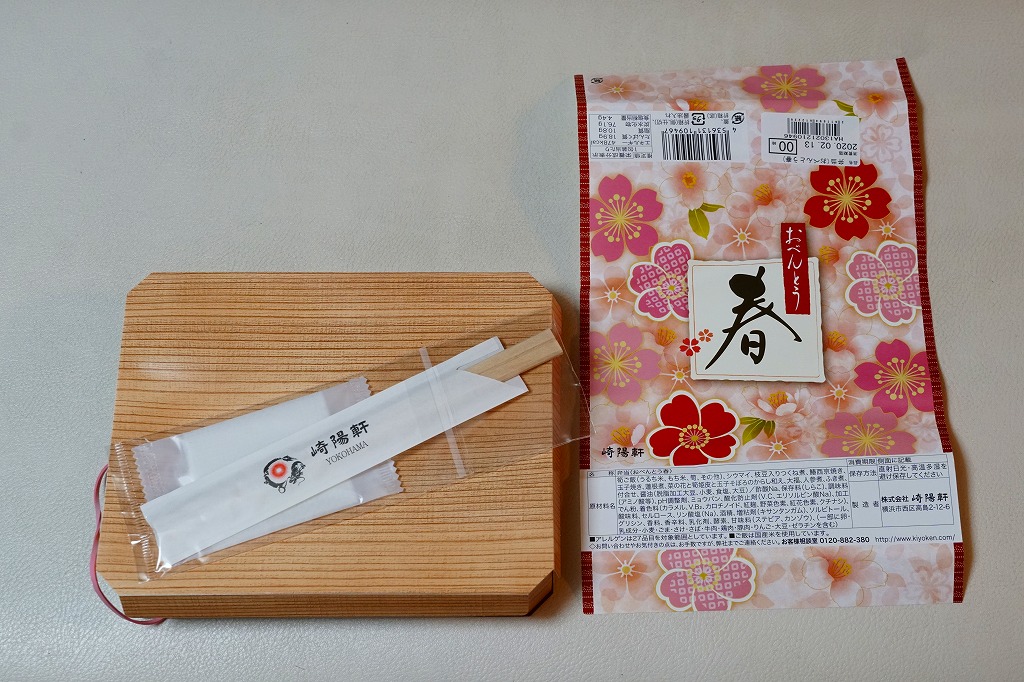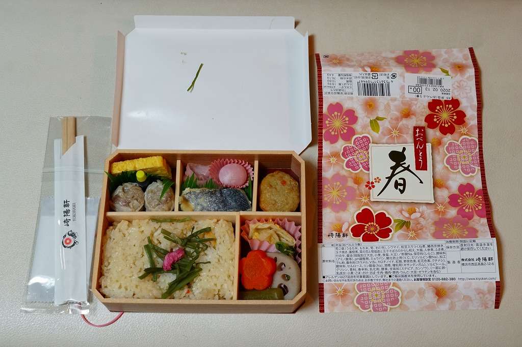 1998(平成10)年に発売された、小柄で安価な横浜駅の春駅弁。これは2020(令和2)年版で、2月1日から4月15日までの販売。今回の内容はタケノコ御飯、サワラの西京焼き、ニンジンやフキやレンコンなどの煮物、菜の花やタケノコなどの和え物、玉子焼、桜大根、桜ミニ大福、シウマイ2個。