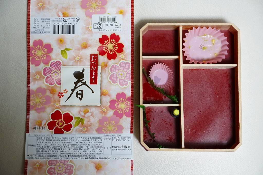 1998(平成10)年に発売された、小柄で安価な横浜駅の春駅弁。これは2021(令和3)年版で、2月1日から4月15日までの販売。今回の内容は前年とそっくりで、タケノコ御飯、サワラの幽庵焼き、つくね旨煮、ニンジンやフキやレンコンなどの煮物、菜の花やタケノコなどの和え物、玉子焼、桜大根、桜ミニ大福、シウマイ2個。