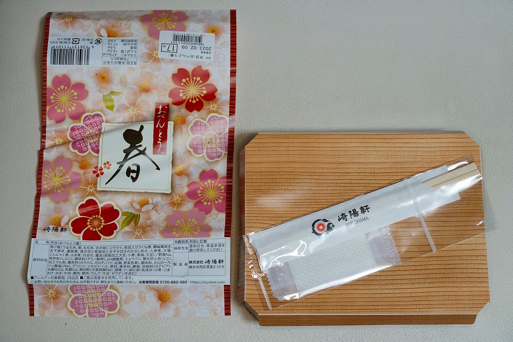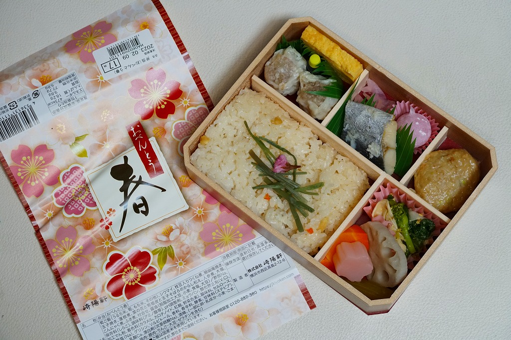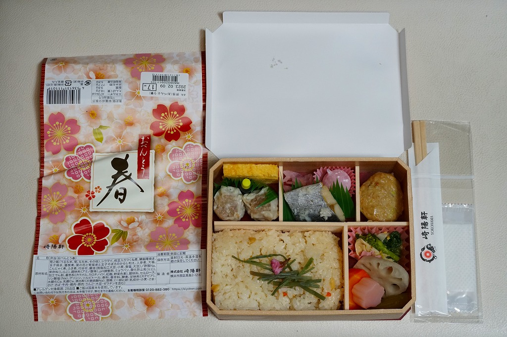 1998(平成10)年に発売された、小柄で安価な横浜駅の春駅弁。これは2023(令和5)年版で、2月1日から4月15日までの販売。春色と桜花でできている掛紙は、絵柄は2014(平成26)年から、形状は2017(平成29)年から変わらない。中身も前年と同じで、タケノコ御飯、サワラの幽庵焼き、彩りつくねの旨煮、ニンジンやフキやレンコンなどの煮物、菜の花やタケノコなどの辛子和え物、玉子焼、桜大根、桜ミニ大福、シウマイ2個。価格は50円アップ。