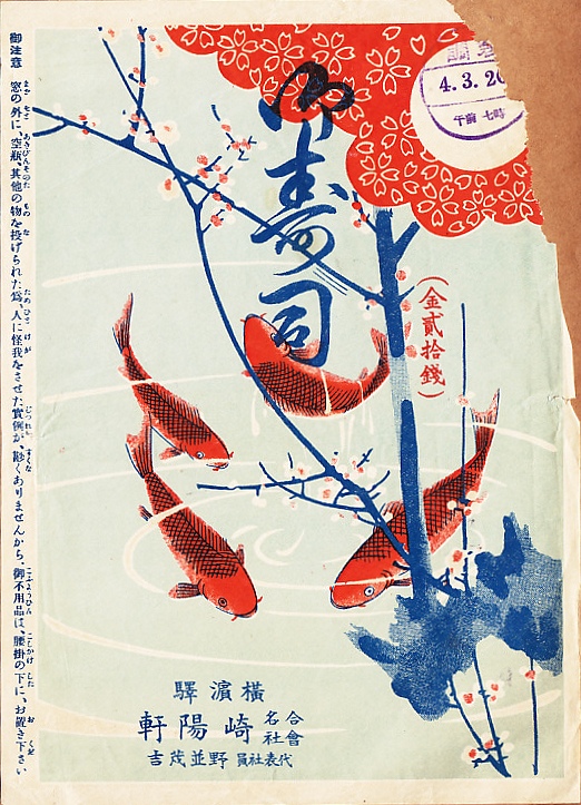 1929(昭和4)年3月20日7時の調製と思われる、昔の横浜駅弁の掛紙。桜か梅の花が咲く池に赤い鯉が集う構図か。