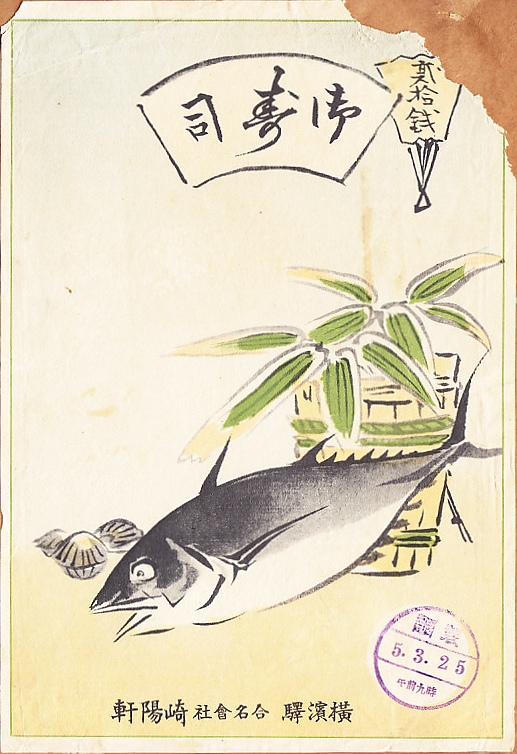 1930(昭和5)年3月25日9時の調製と思われる、昔の横浜駅弁の掛紙。マグロとホタテと木桶と笹を描いているように見える。駅名と定価の記載はあるが、鉄道に関する注意書きがないので、駅弁でなく市中の弁当向けの掛紙かもしれない。
