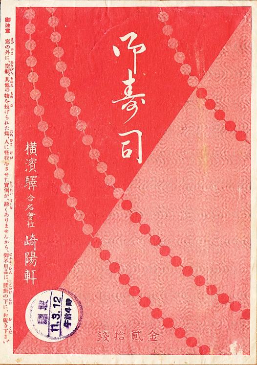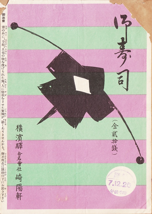 1932(昭和7)年12月26日1時の調製と思われる、昔の横浜駅弁の掛紙。ヤジロベエのようなもののみが描かれる、特徴のない絵柄。真夜中でも汽車が来て駅弁が売れた静岡駅などと違い、すべての列車の始発駅や終着駅であった東京駅から30分の距離で、深夜に客を乗せた汽車が来ることのない横浜駅。午前1時に寿司を調製して、誰に販売したのかが気になる。
