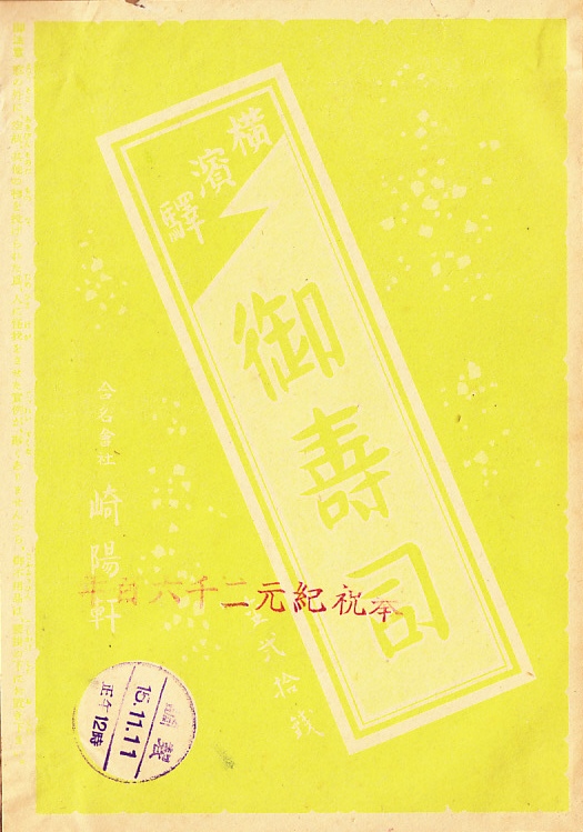 1940(昭和15)年11月11日12時の調製と思われる、昔の横浜駅弁の掛紙。この年の紀元二千六百年、神武天皇の即位を紀元とする暦で2600年であることを記念した駅弁の掛紙は各地にあるが、これを「奉祝紀元二千六百年」のスタンプで済ませるものは、あまり見たことがない。