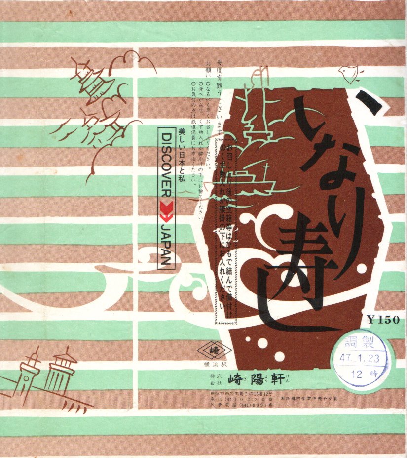 1972(昭和47)年1月23日12時の調製と思われる、昔の横浜駅弁の掛紙。2001(平成13)年8月1日発売の「いなりずし(500円)」の掛紙に、この六角形の背景と文字の絵柄が流用された。
